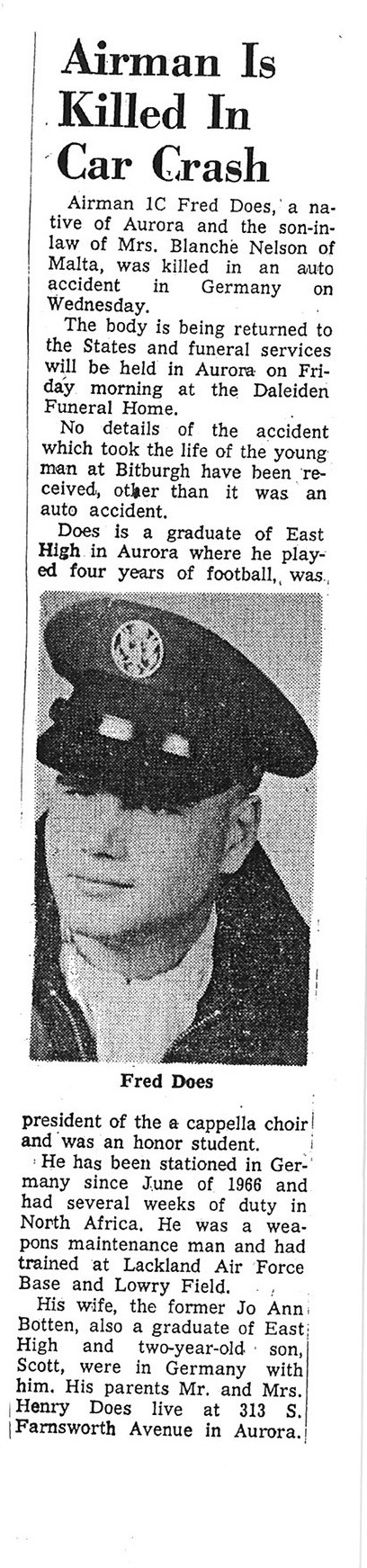 There is no information given in the obit other than he died in Germany in an auto accident