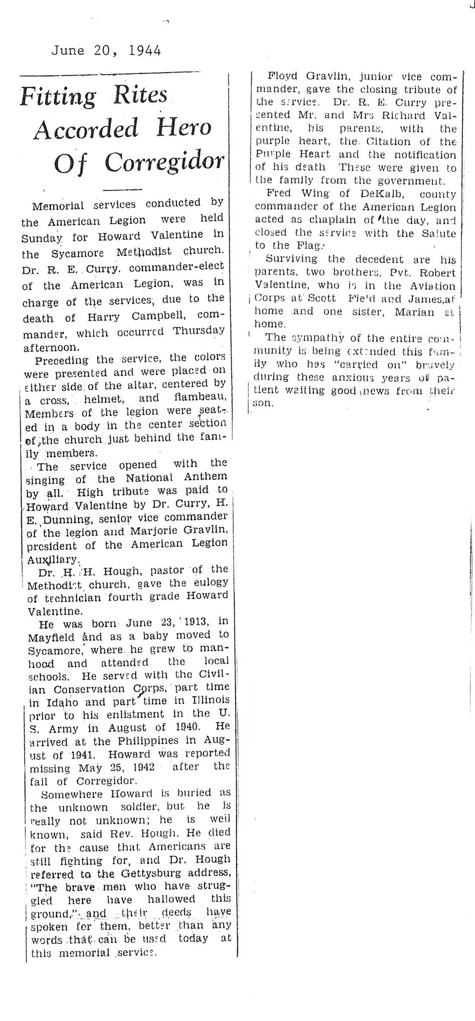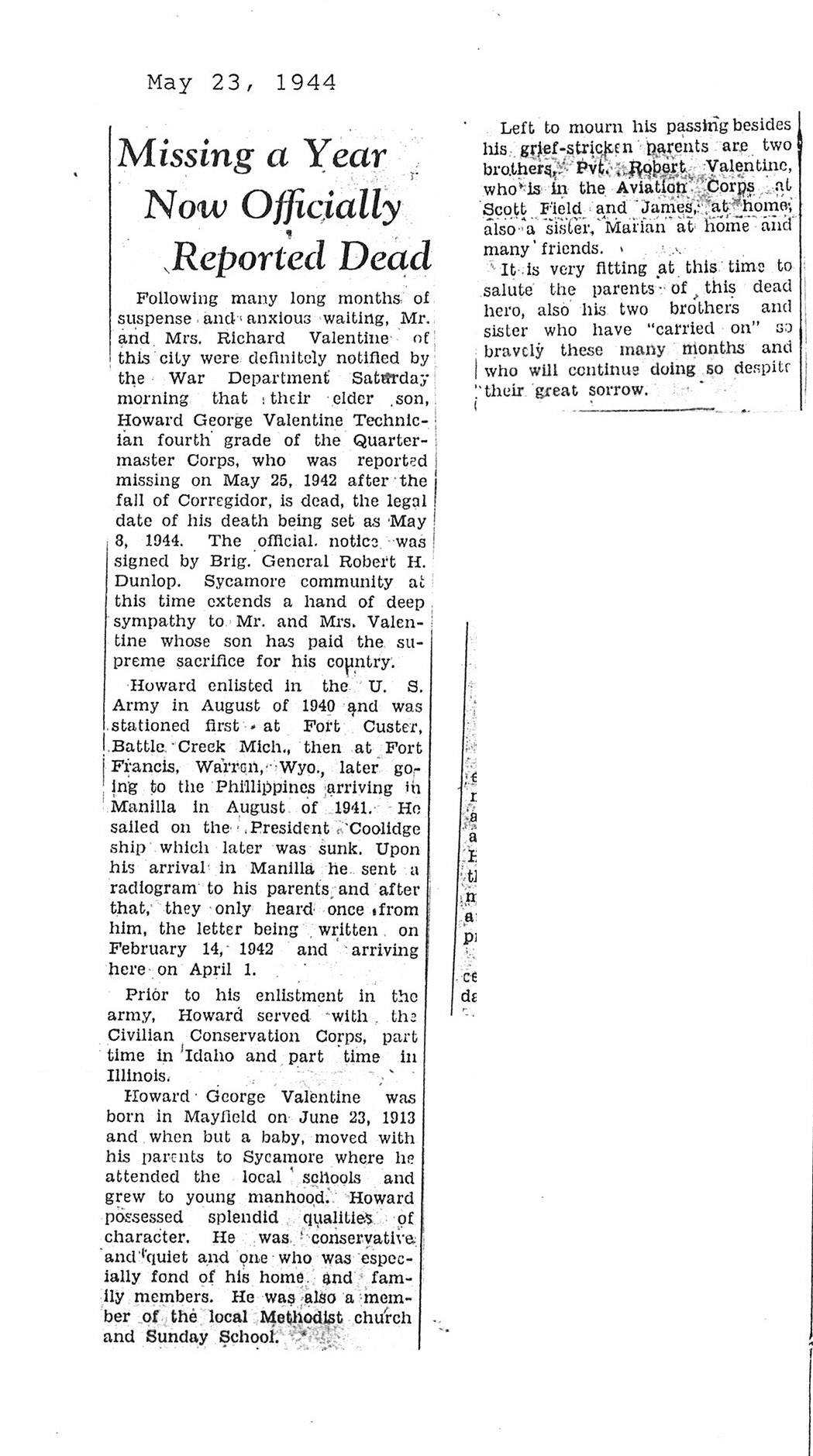 Reported missing after the fall of Corregidor in Phillipines