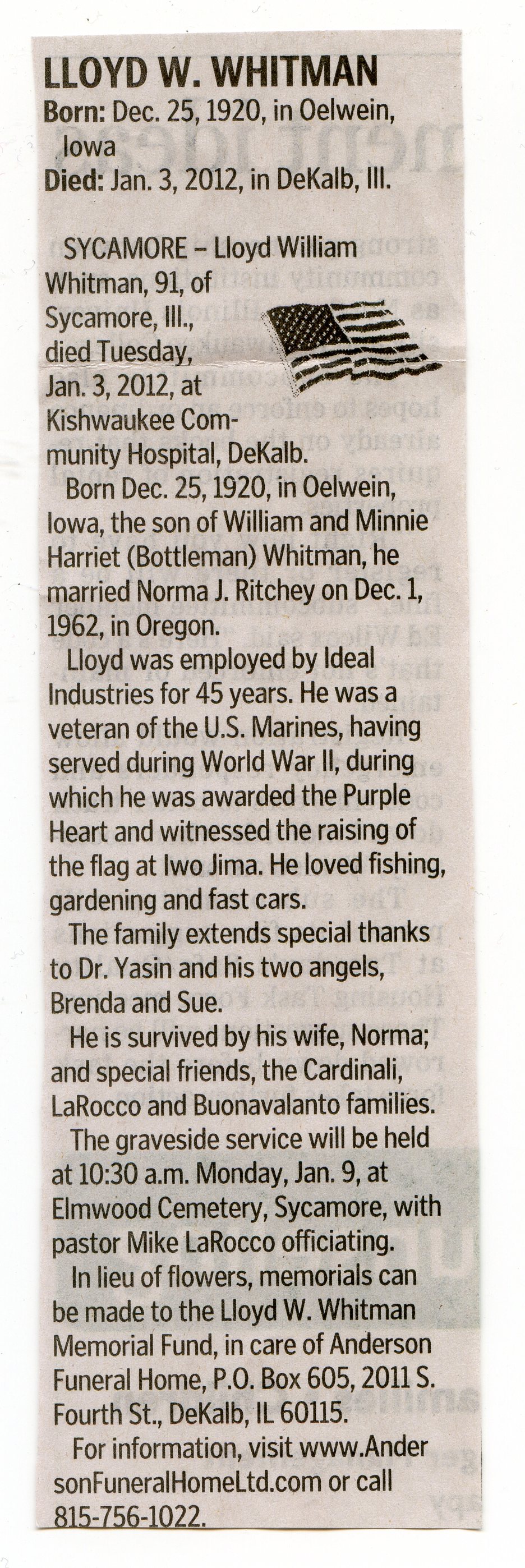 U. S. Marines, World War II. Awarded Purple Heart.