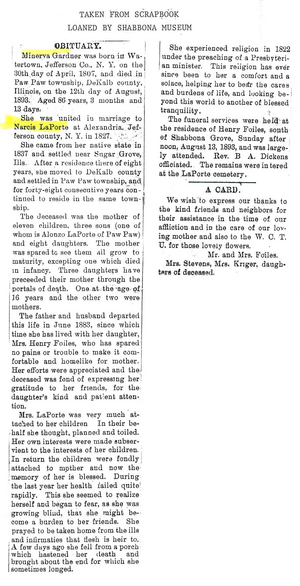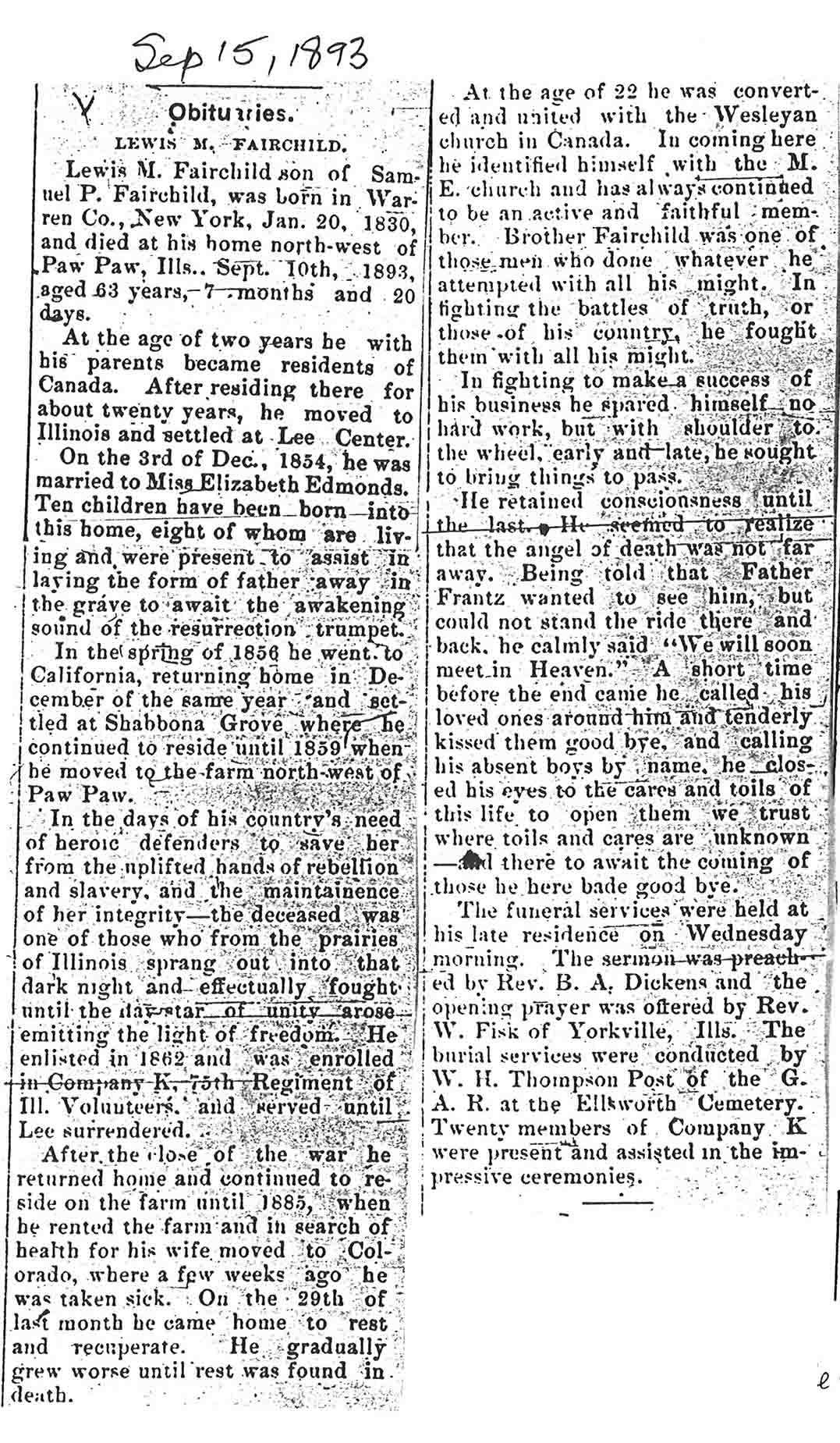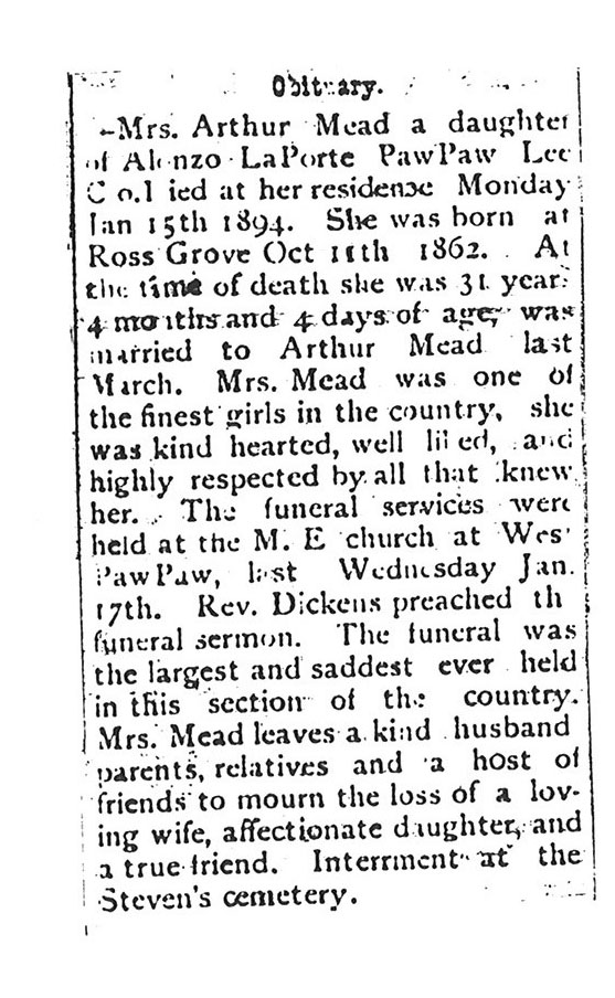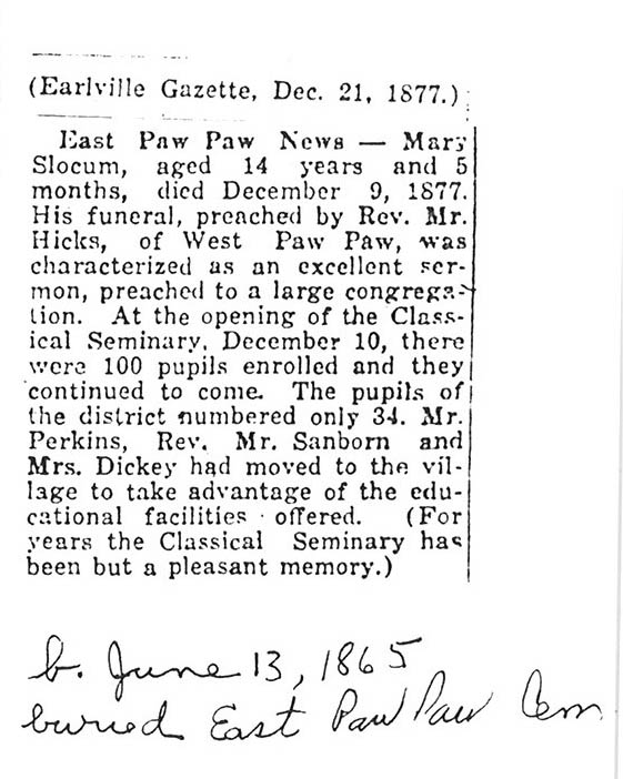 Buried in East Cemetery, Paw Paw, IL