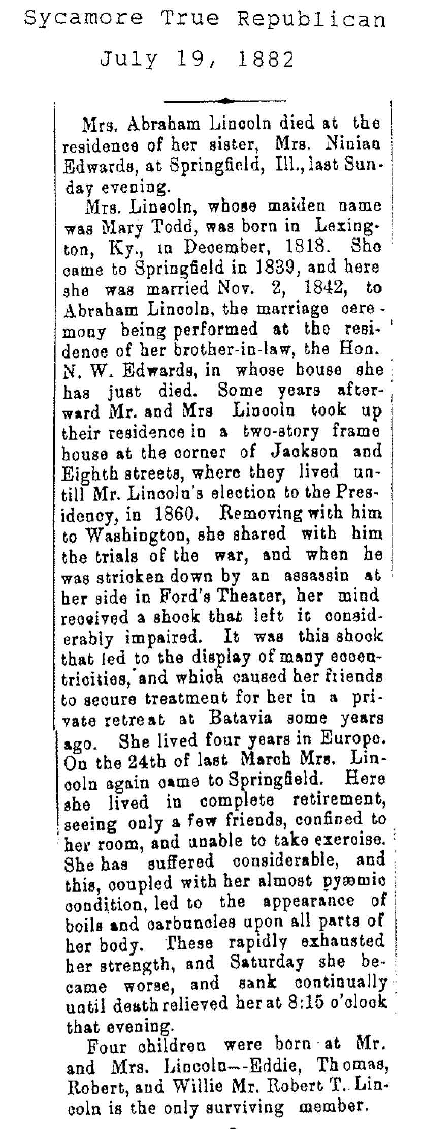 Birth - December 1818 Maiden name - Todd wife of President Abraham Lincoln