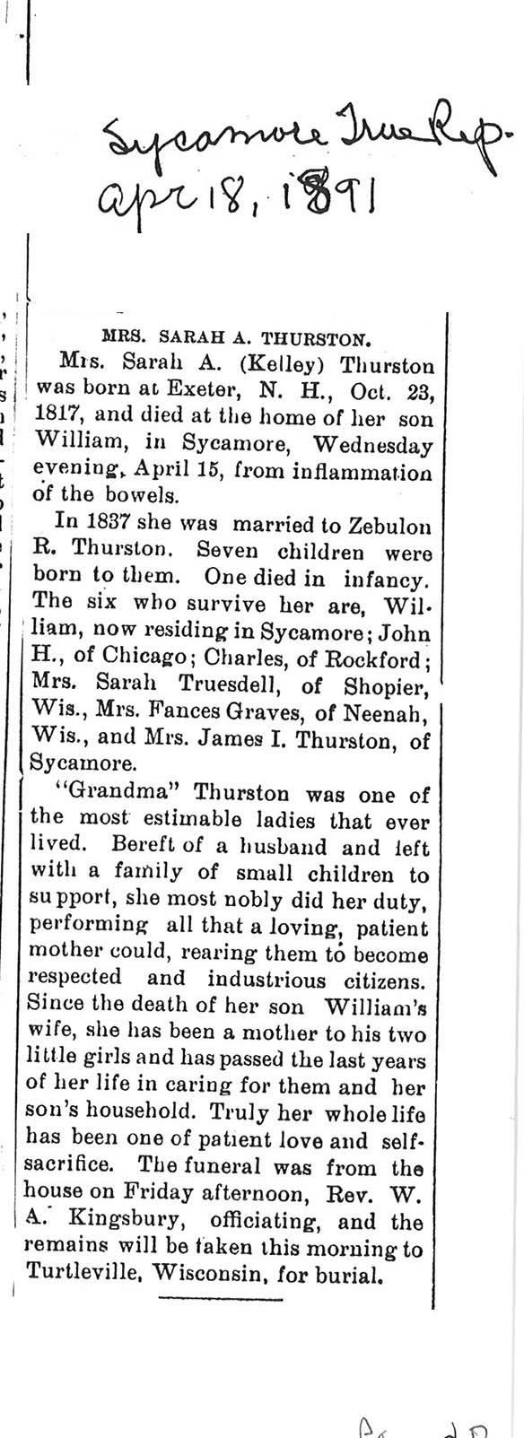 Maiden name - Kelley Buried in Turtleville, WI