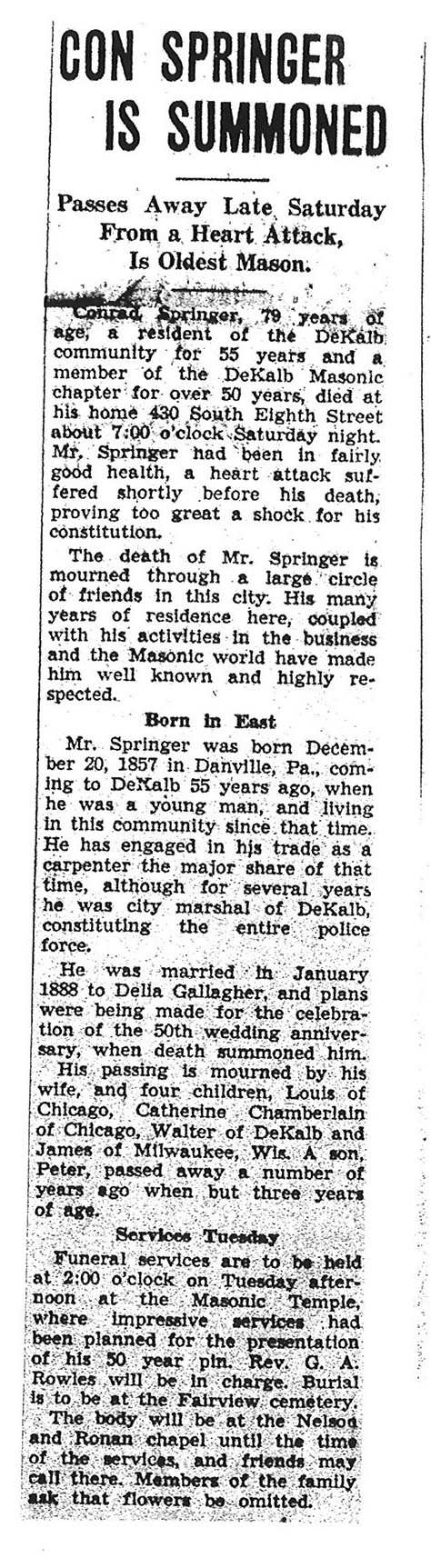 This Obit is from the collection of Louise Rowan Witherhall. It does not give a date of his passing but does state in the article that he had just finished doing the tax assessments for 1936. Depending on when they are done, he passed away either in 1935 or 1936.