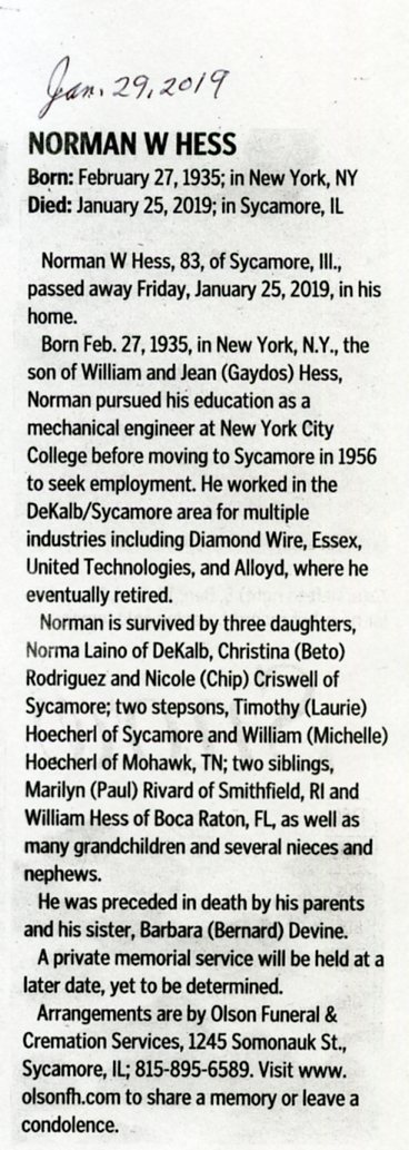 This obituary is not clear on the year of his passing. There is a handwritten year at the top of the article that says 1955 if that is the case than the year he was born, or his age is wrong. It states that the year he was born was 1928 and it also says he was 22 when he passed away which would make the year 1950 that he passed away.