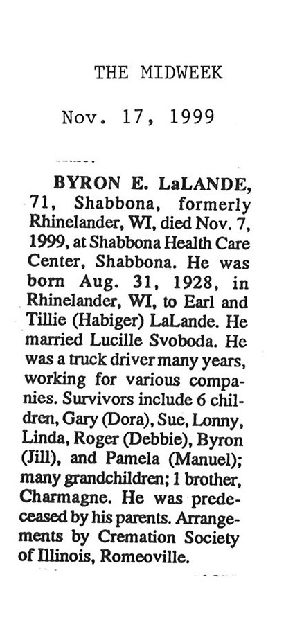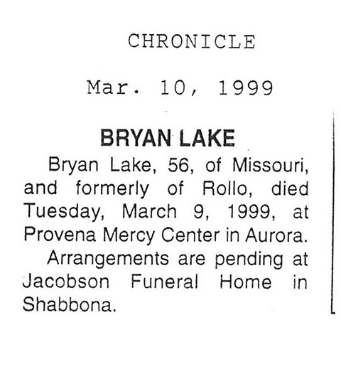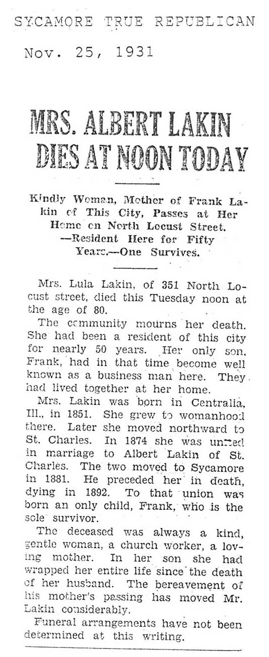 Same obit in Sun-Tribune, Sycamore, IL 12/31/1968