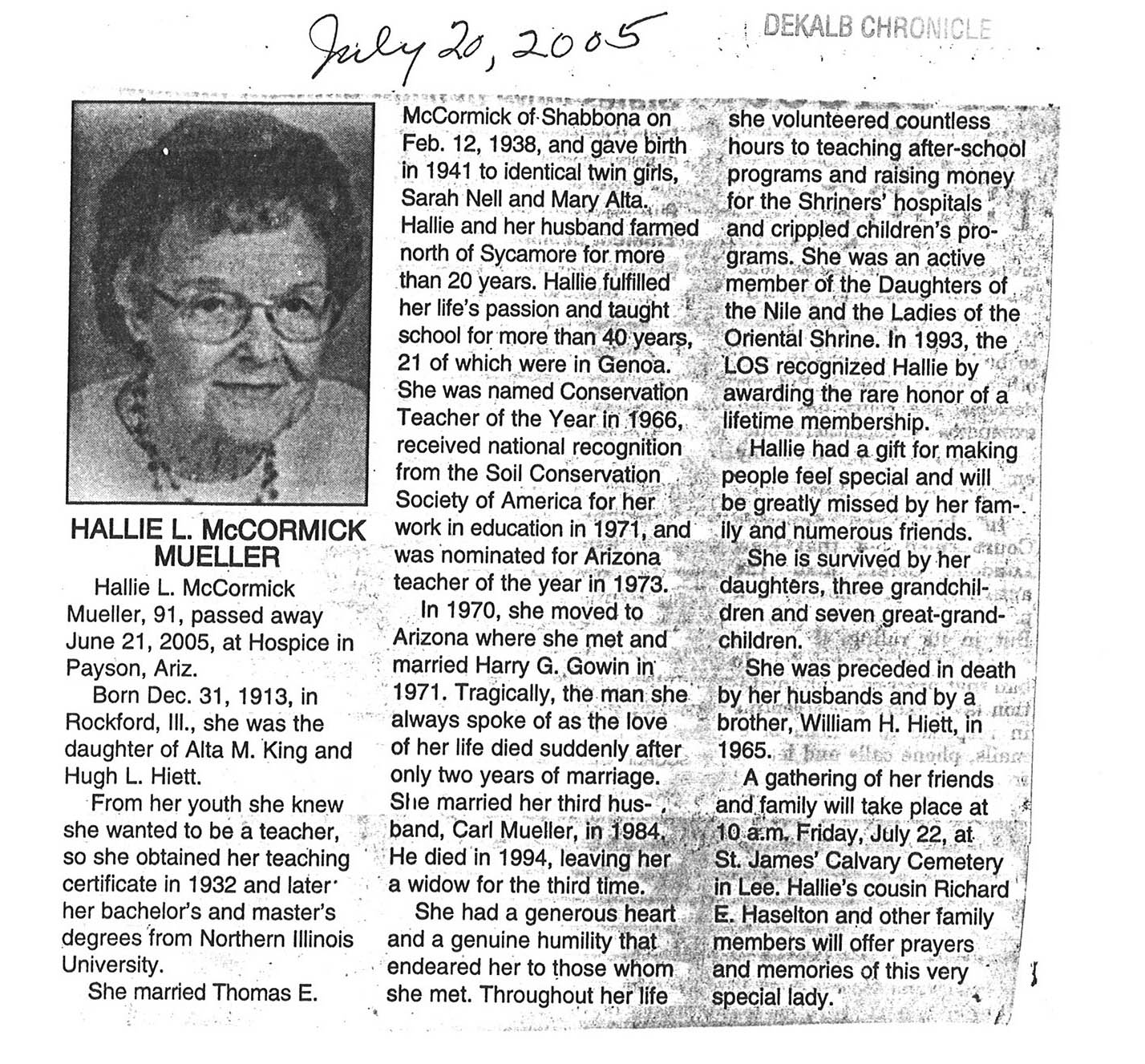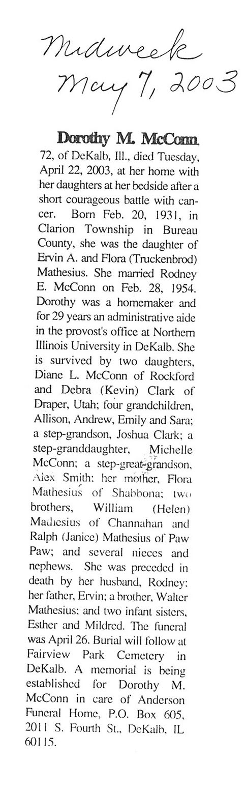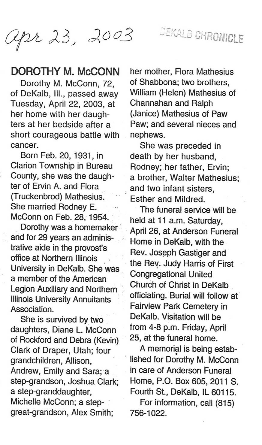 Buried in cemetery south of Lee, IL