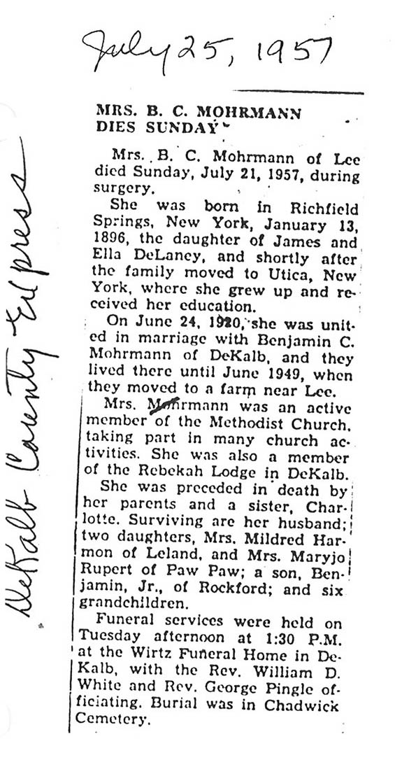 Originally buried at Hoyt Cemetery; moved to Elmwood Cemetery in Sycamore when Hoyt was abandoned. In section H at Elmwood.