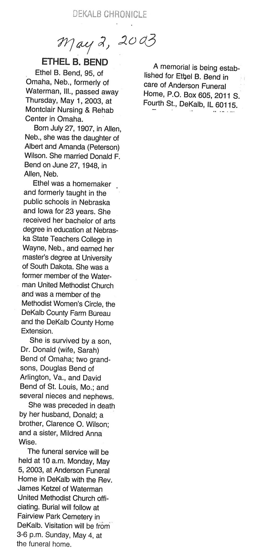 Buried in Wyoming Cemetery - Paw Paw, IL