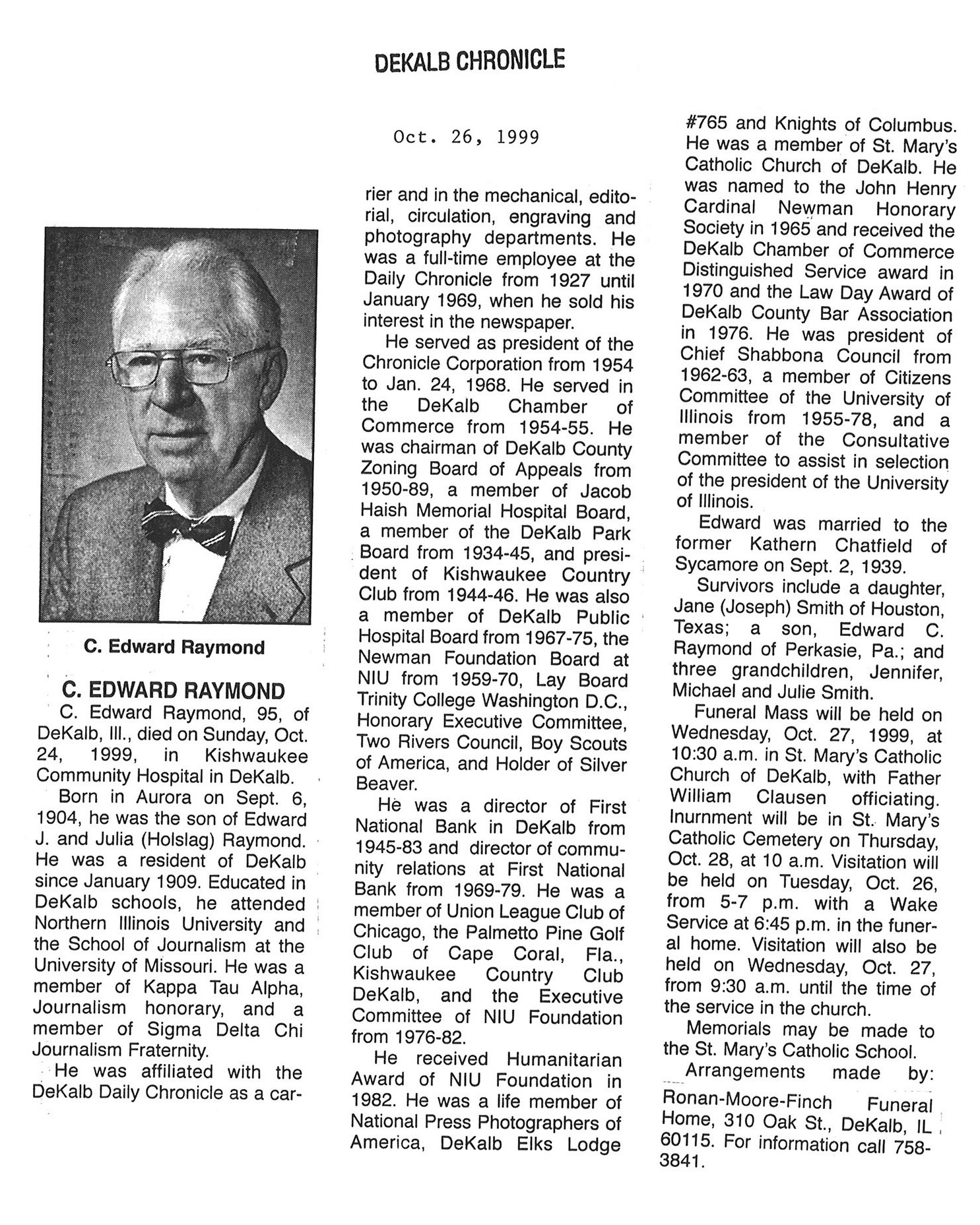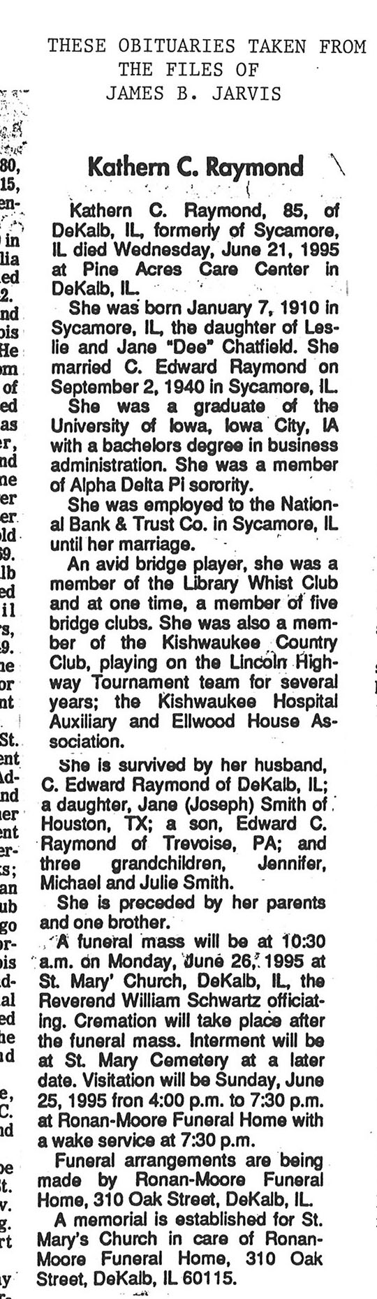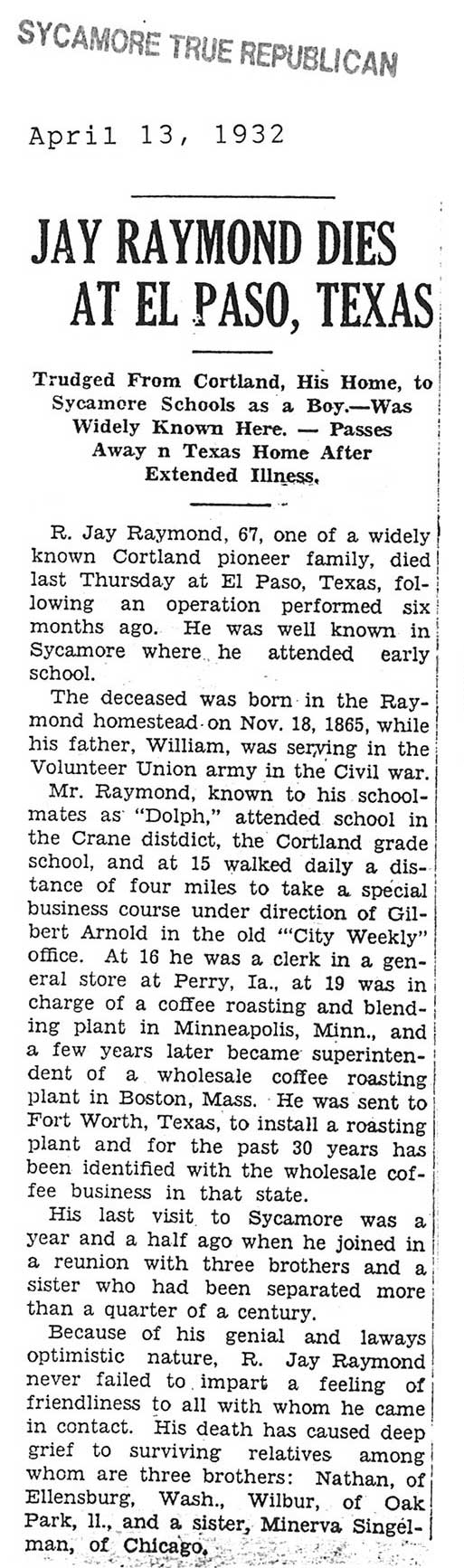 Wife is Elizabeth (Smith) Raymond and she is buried in Mt. Carmel in Sycamore