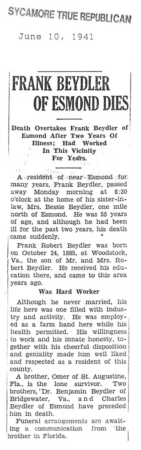 Civil War, 1861-1866, 8th Illinois Cavalry and 17th Illinois Cavalry. More information in obit Book 2, Page 32.