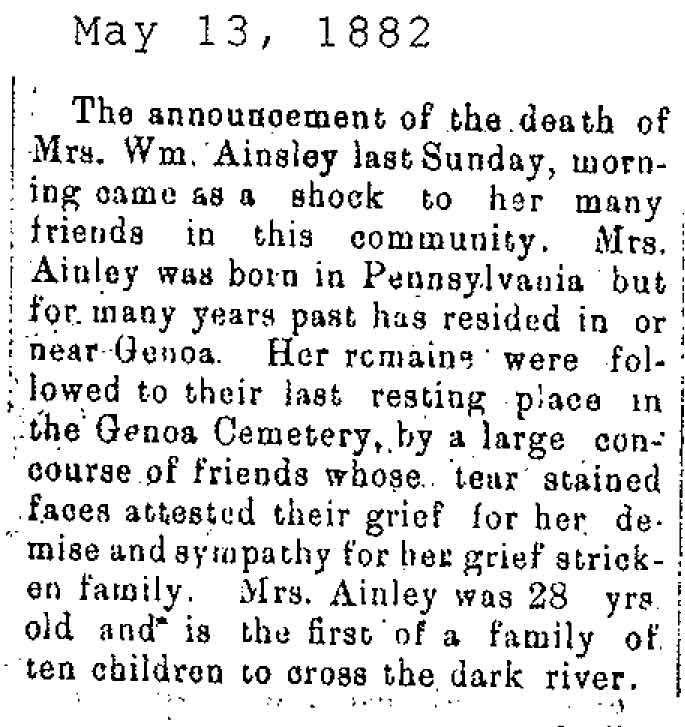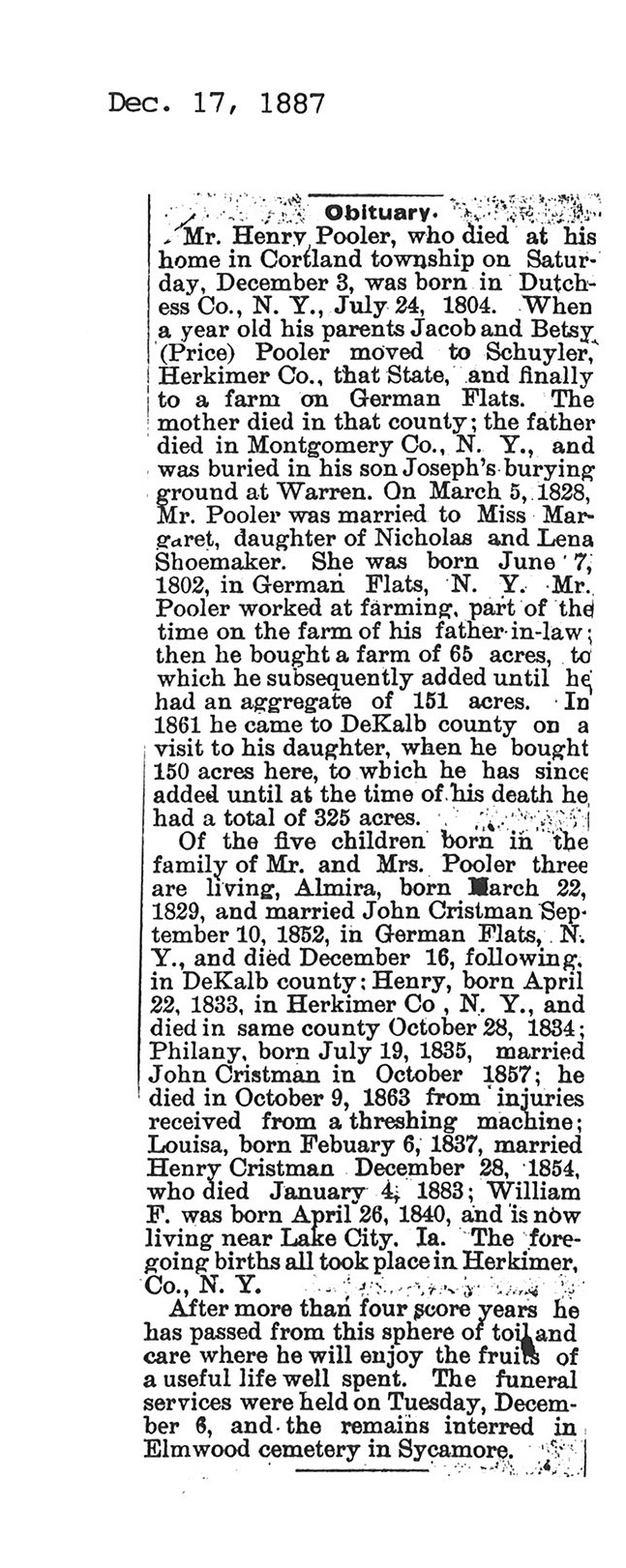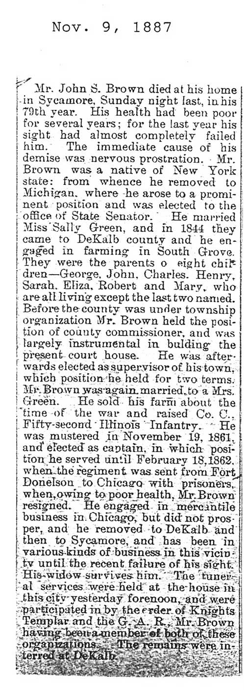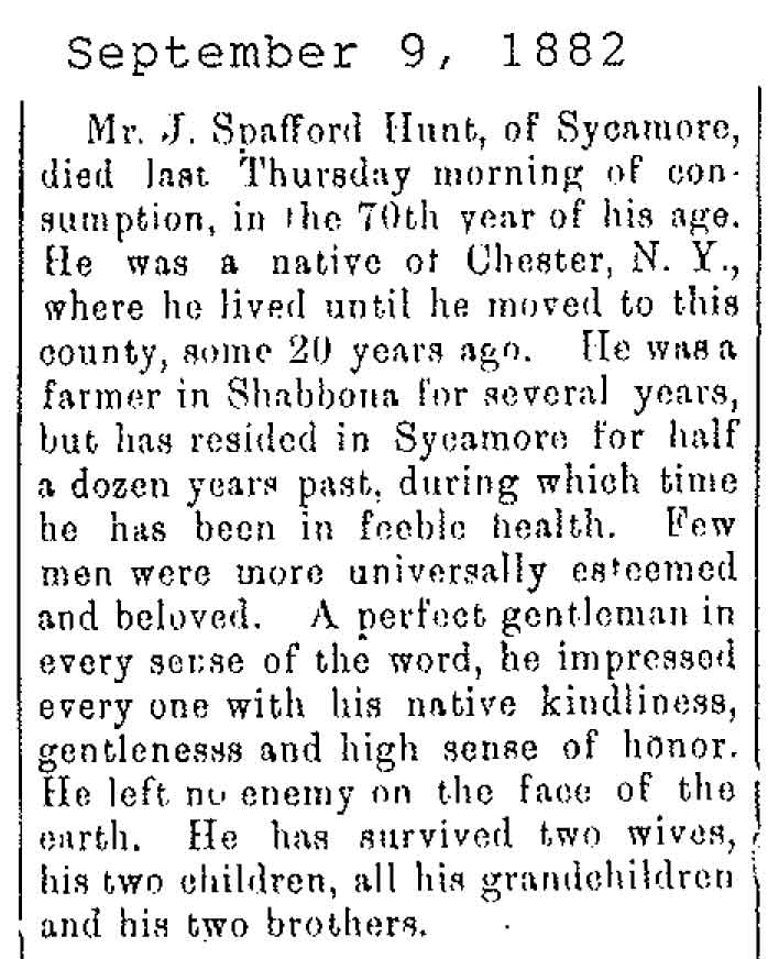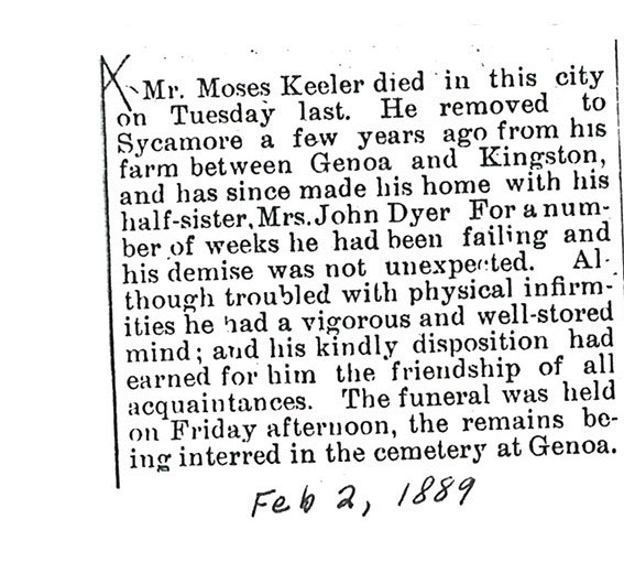 Originally buried at Hoyt Cemetery; moved to Elmwood Cemetery in Sycamore when Hoyt was abandoned. In section H at Elmwood.