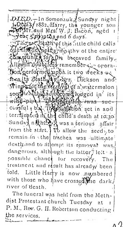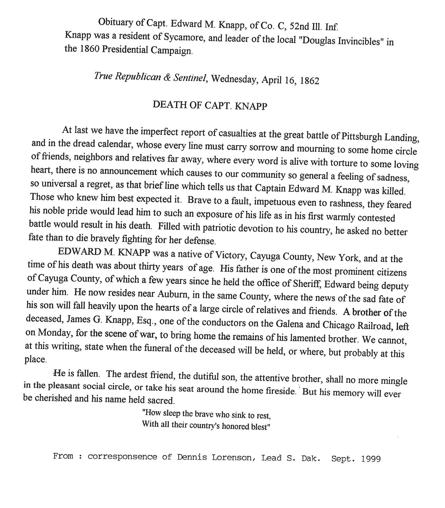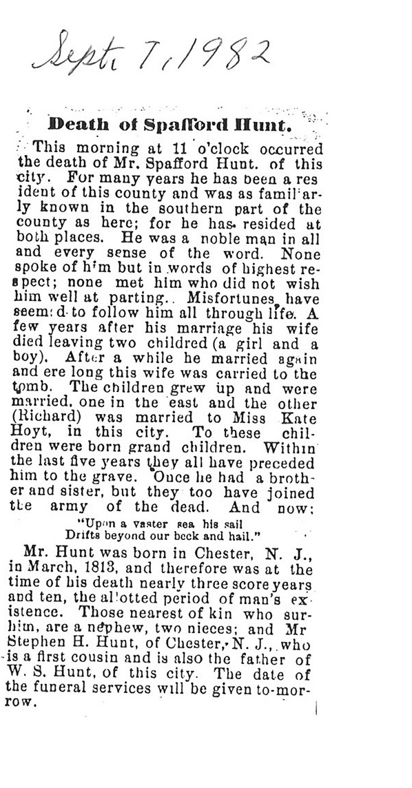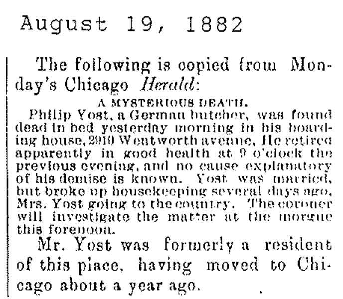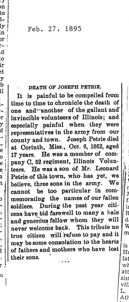 Originally buried at Hoyt Cemetery; moved to Elmwood Cemetery in Sycamore when Hoyt was abandoned. In section H at Elmwood.