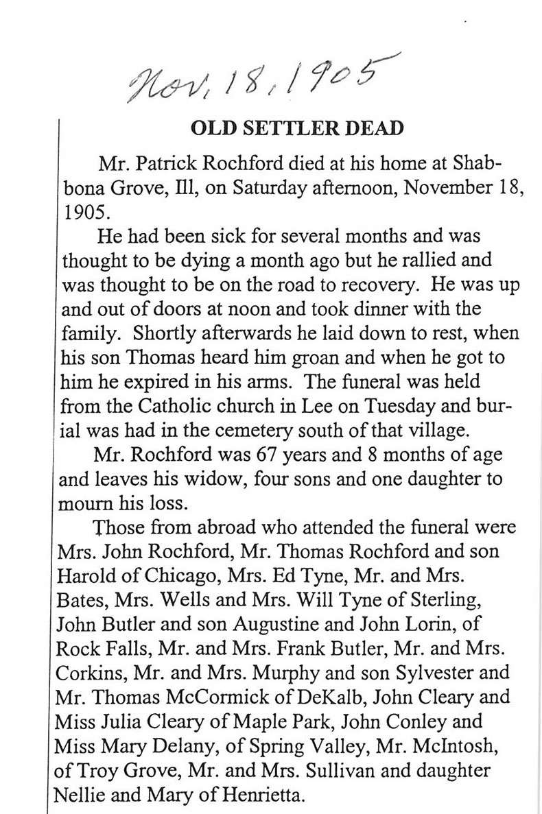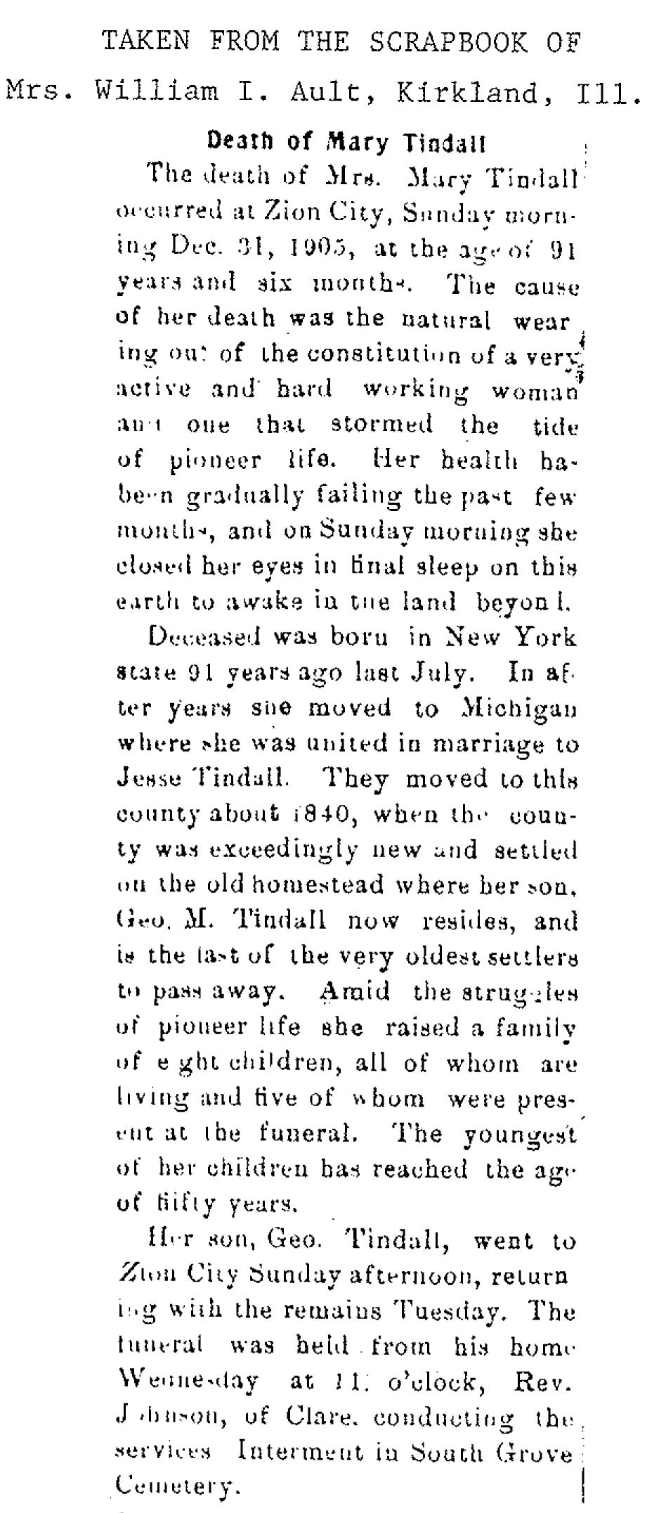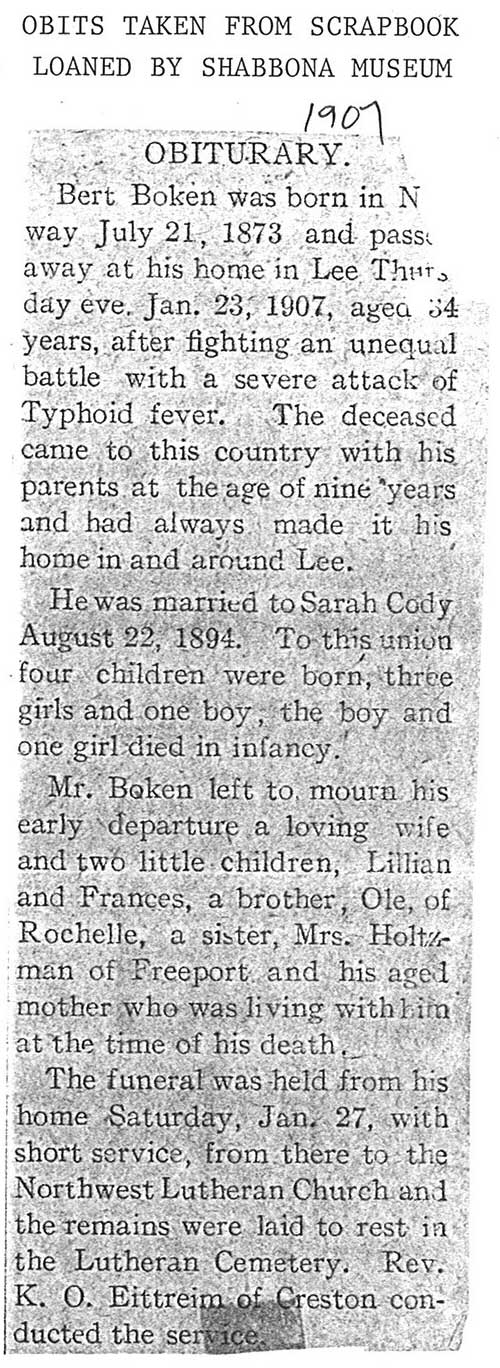 Buried in cemetery south of Lee, IL
