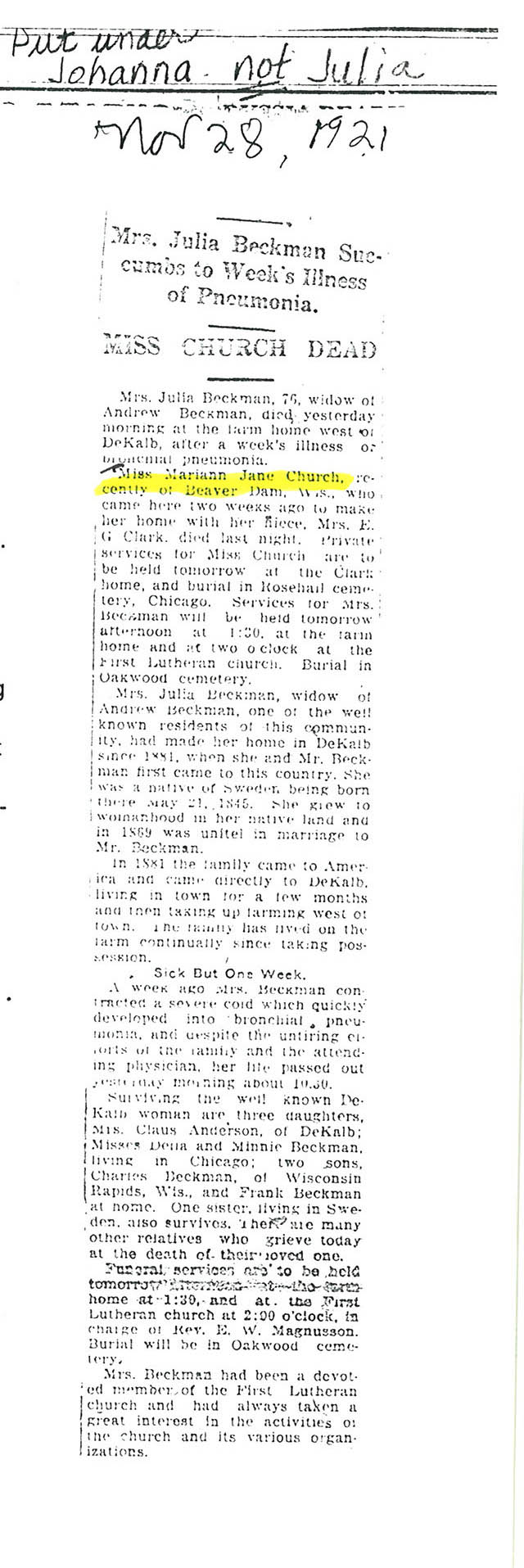 Buried in the Lutheran Cemetery - Lee, IL