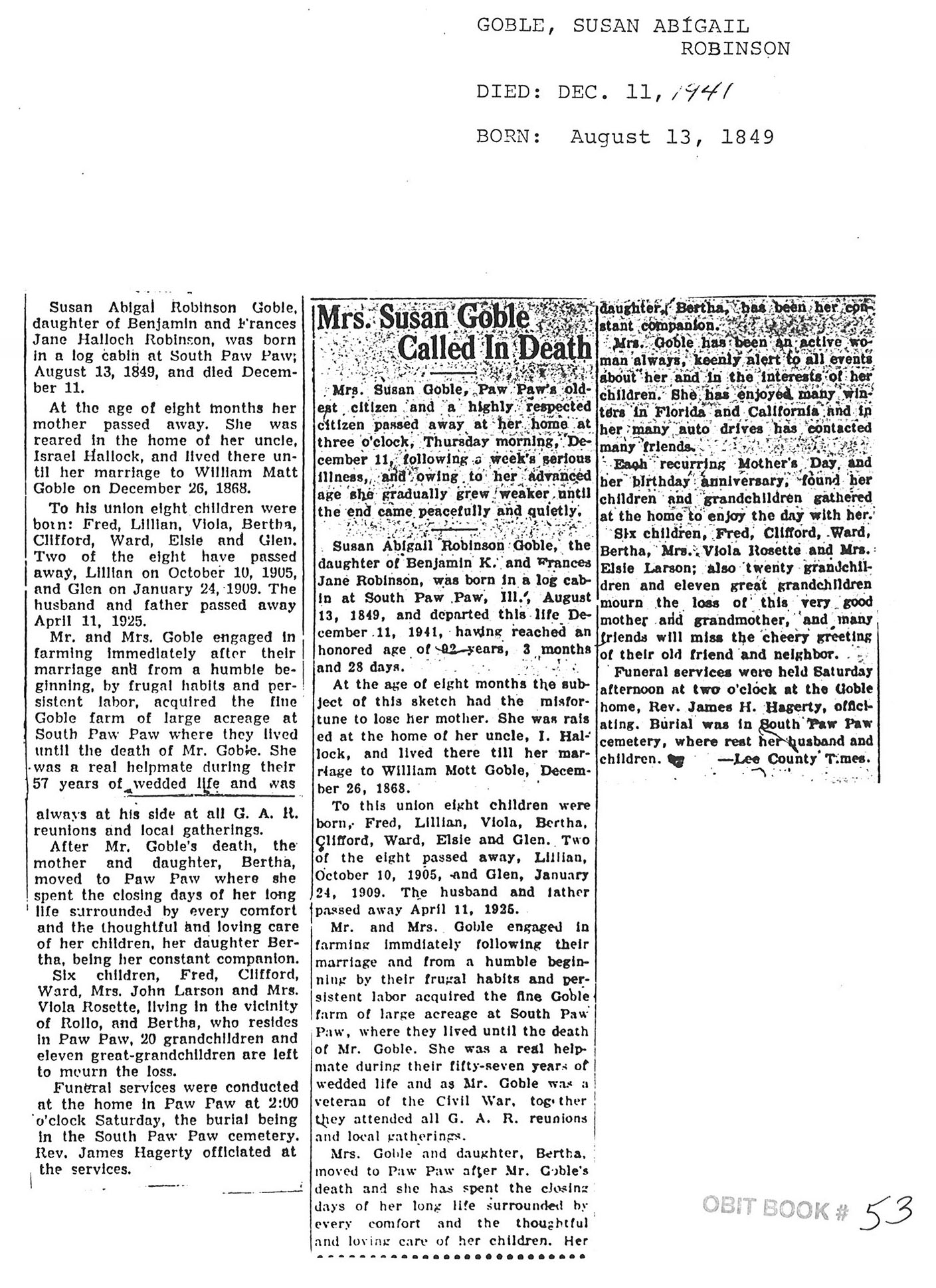 Joiner History Room Obituary DB