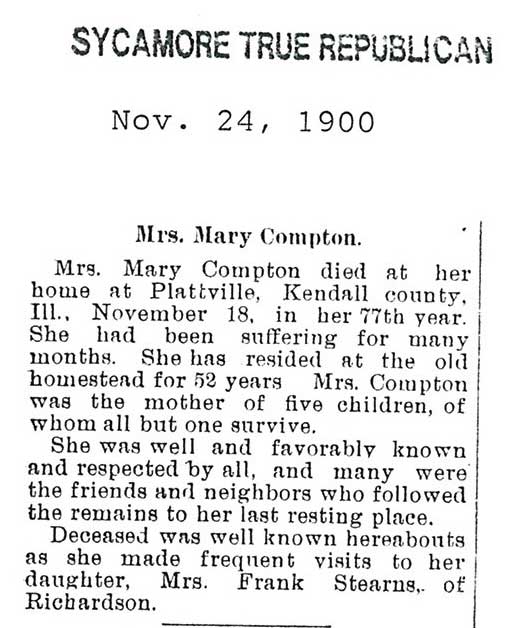 Birth - 24 May 1813 Maiden name - Brisbin Buried in S. Burlington Cemetery.