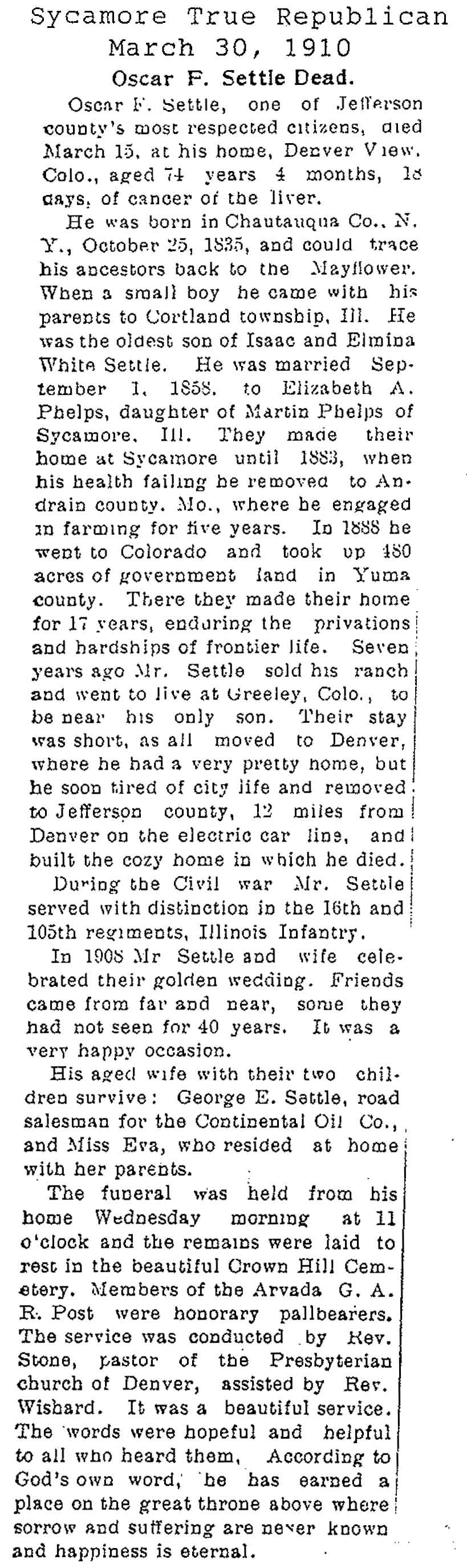 Civil War, 1861-1866, 8th Illinois Cavalry and 17th Illinois Cavalry. More information in obit Book 2, Page 32.