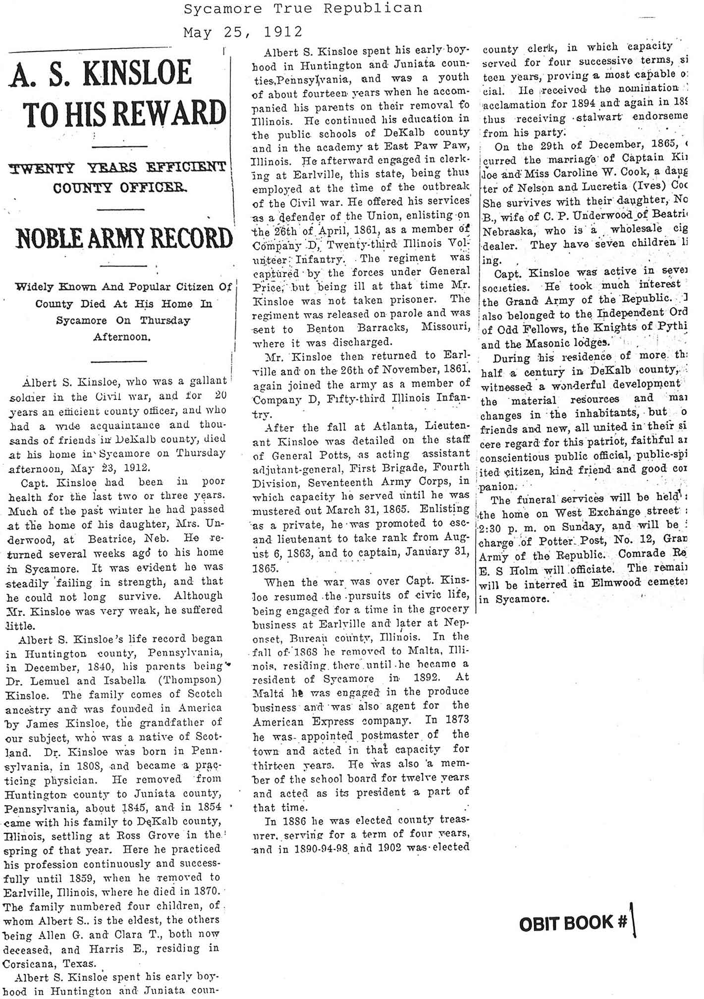 Reinlisted Nov 1861, Company D, Fifty-Third Illinois Infantry, Captain. Served in battles at Pittsburgh Landing, Corinth, Memphis, Bolivar and Vicksburg. Was detailed as acting assistant adjutant general of the staff of General Potts until mustered out in March, 1865