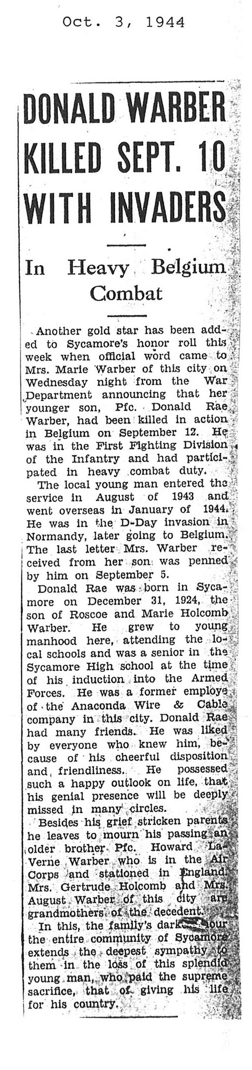 Killed in action in Belgium