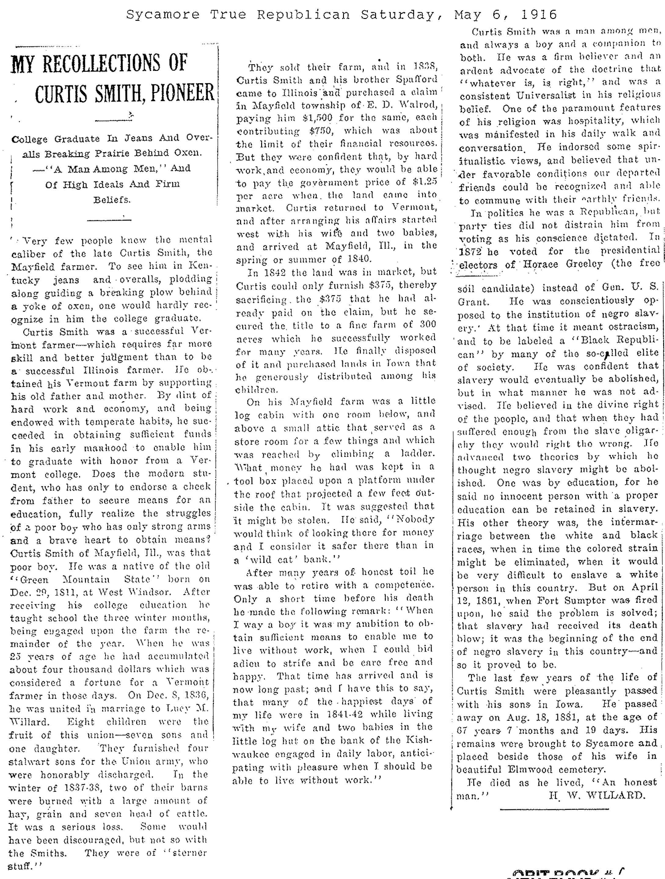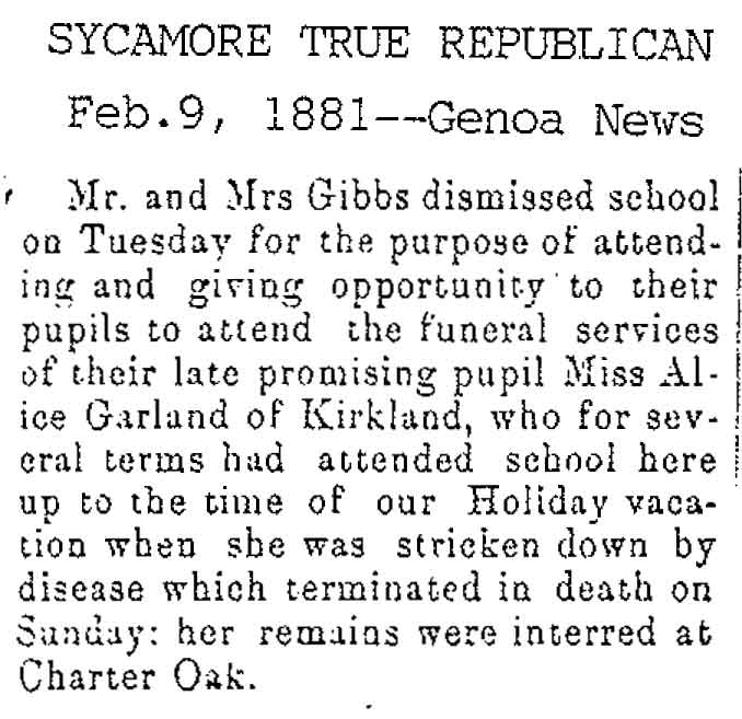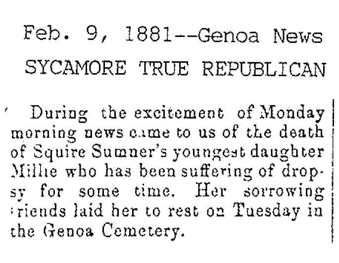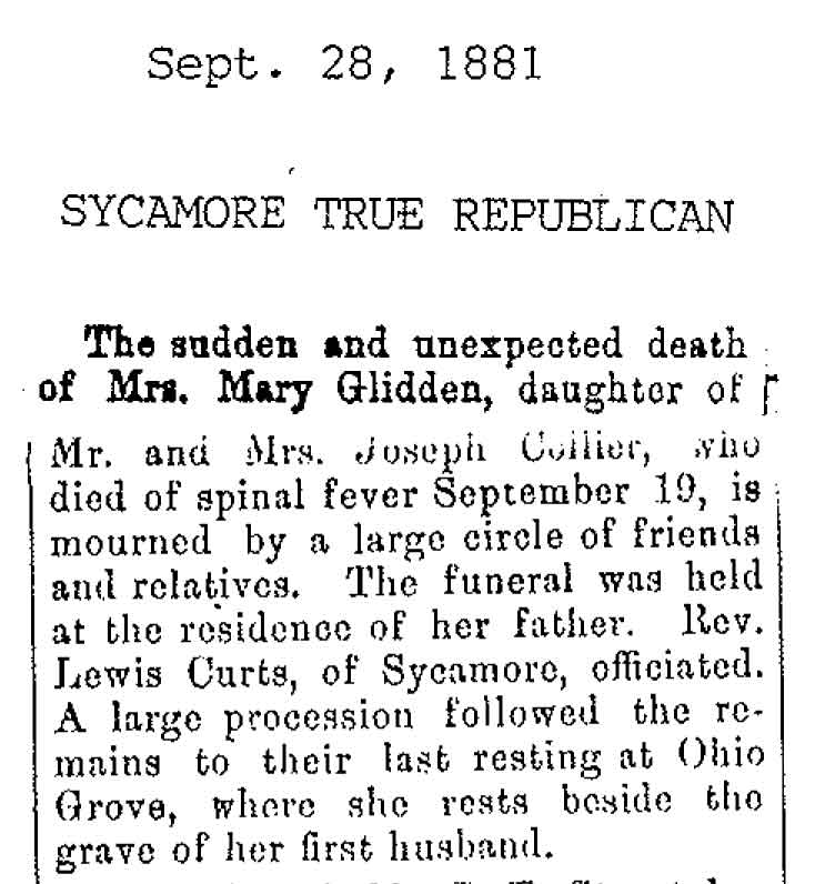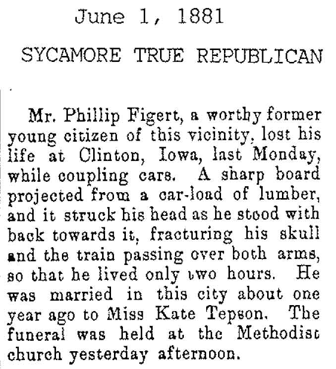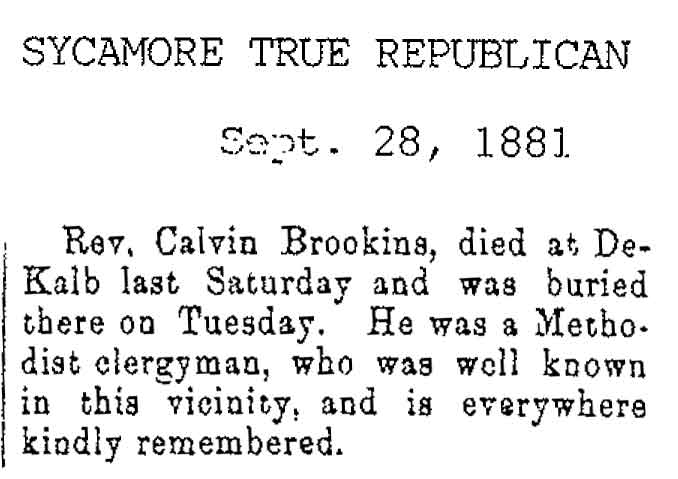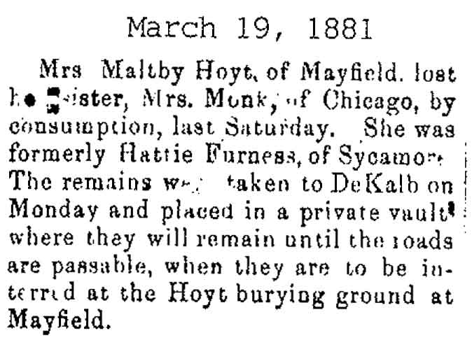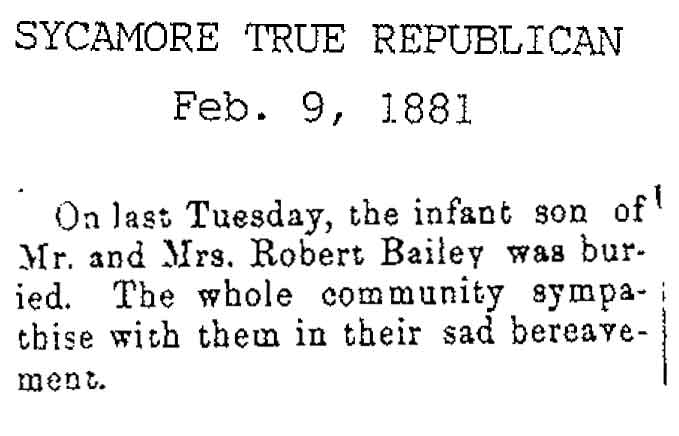 Originally buried at Hoyt Cemetery; moved to Elmwood Cemetery in Sycamore when Hoyt was abandoned. In section H at Elmwood.