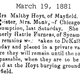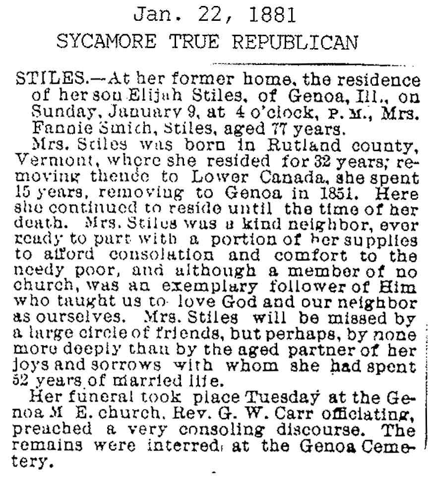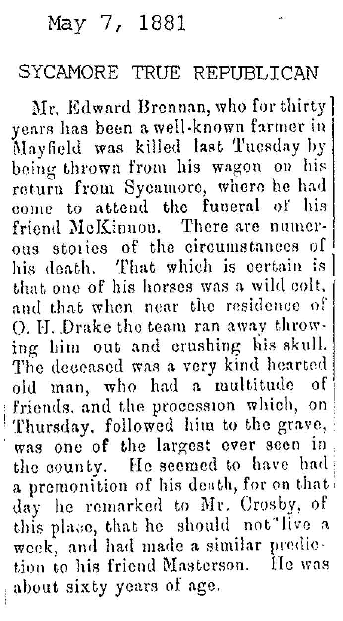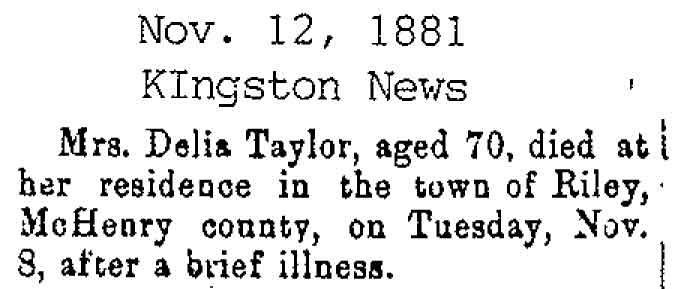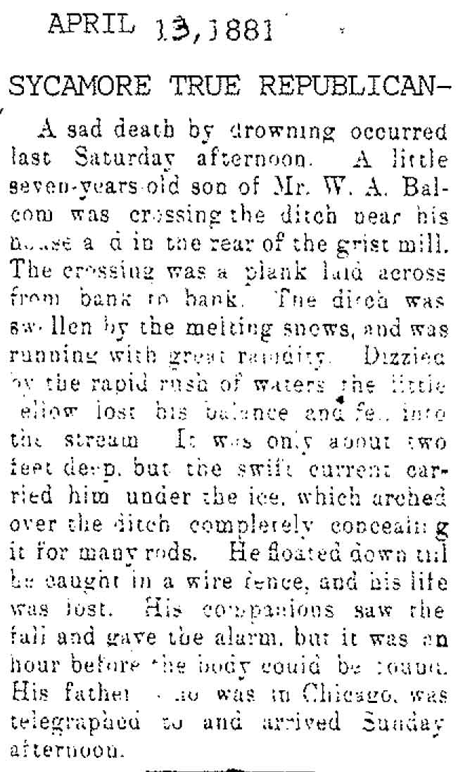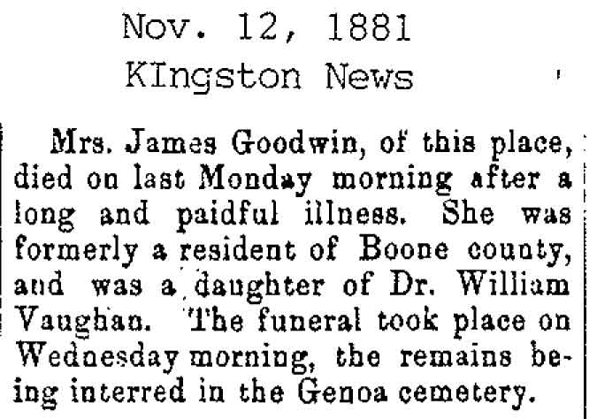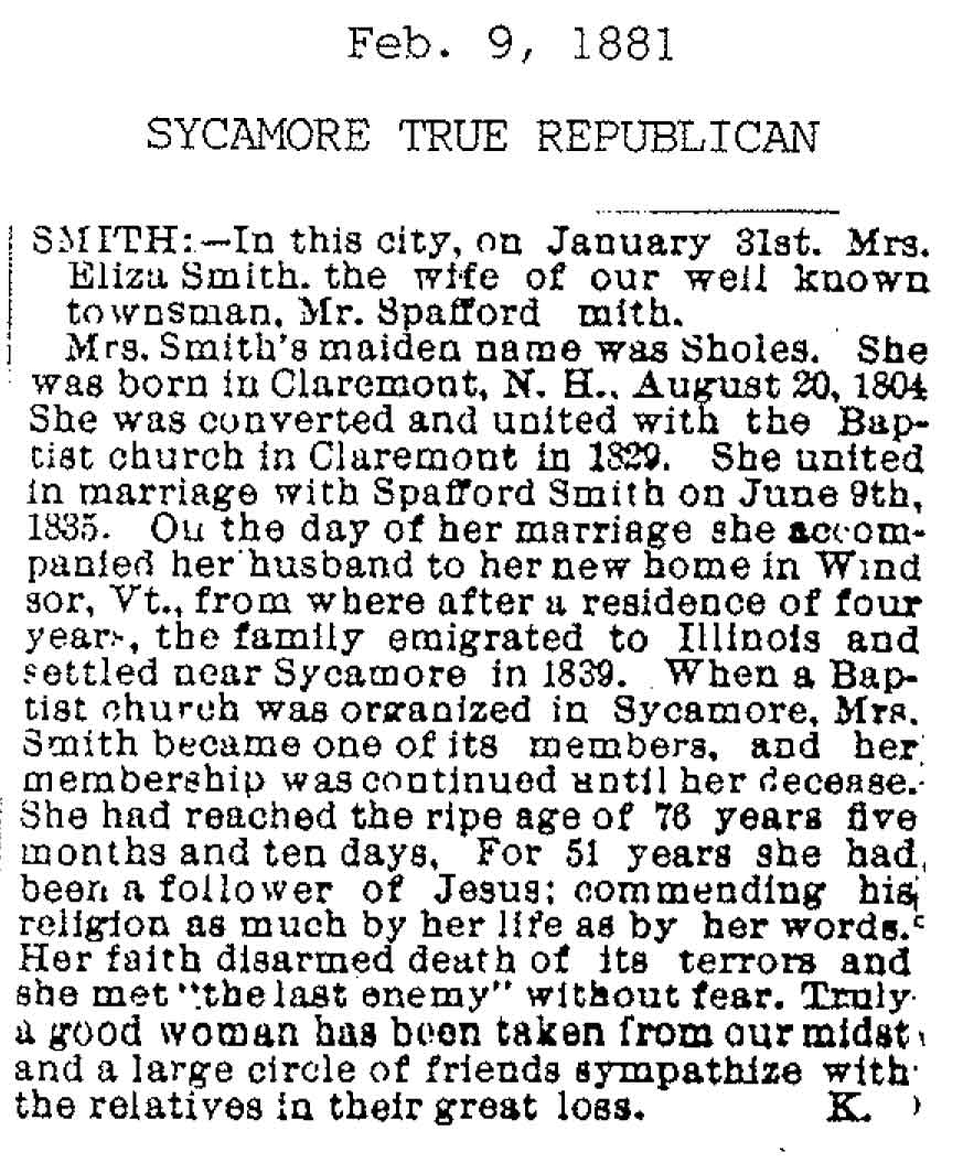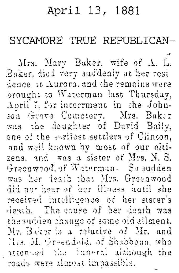 Originally buried at Hoyt Cemetery; moved to Elmwood Cemetery in Sycamore when Hoyt was abandoned. In section H at Elmwood.