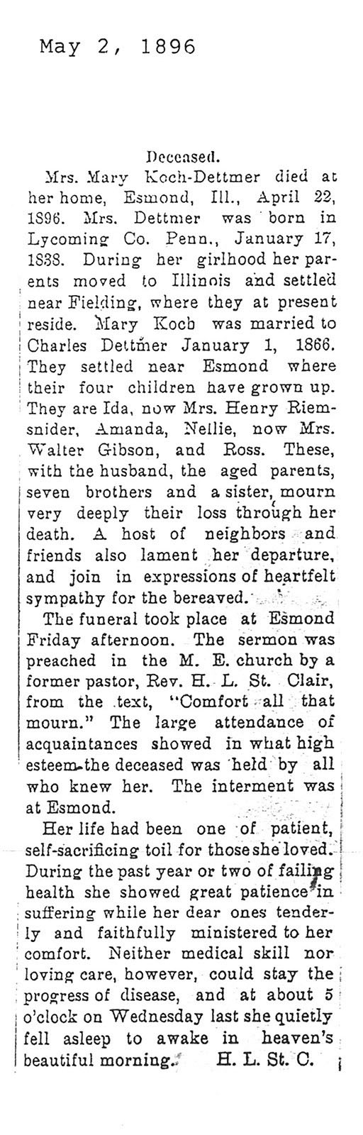 Maiden name - Koch Buried in Greenview Cemetery - Esmond, IL