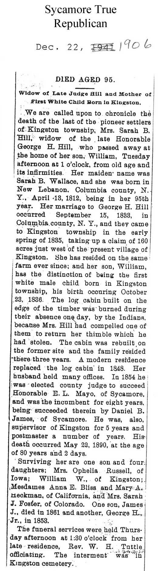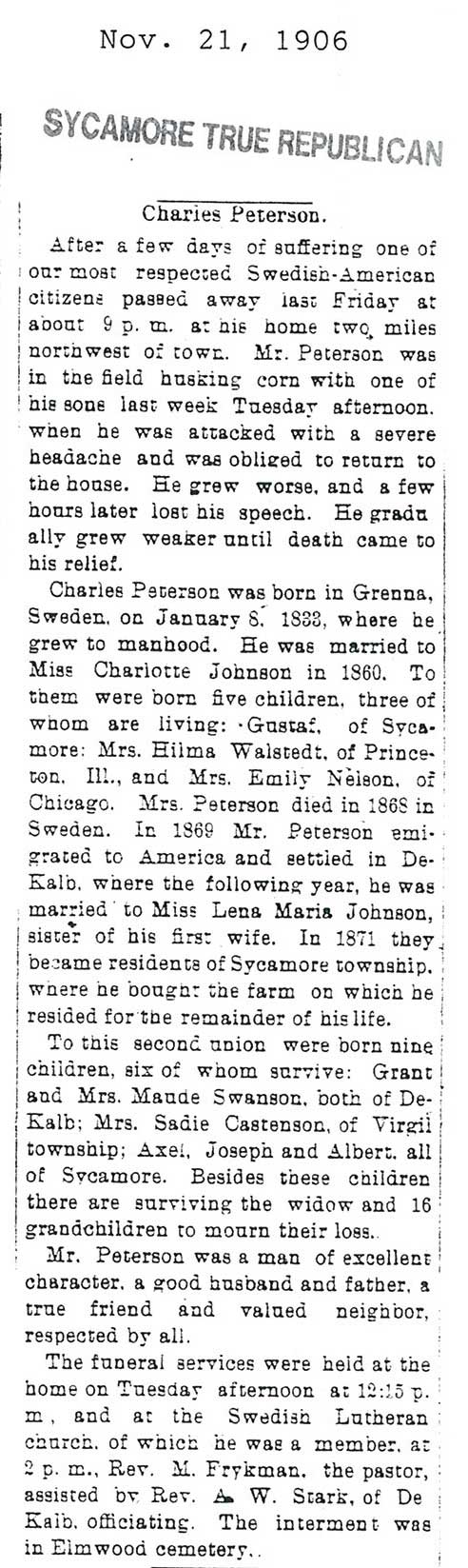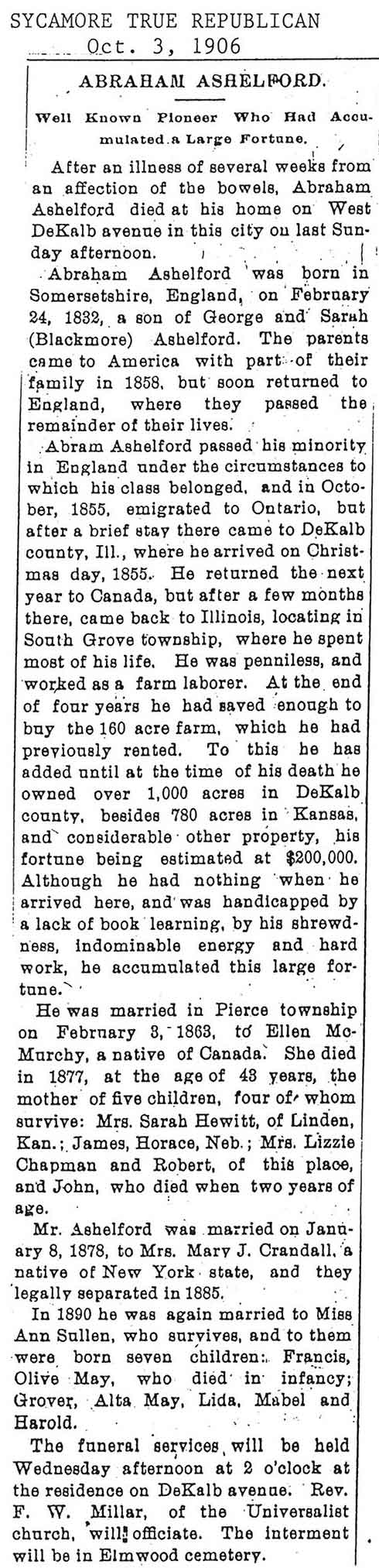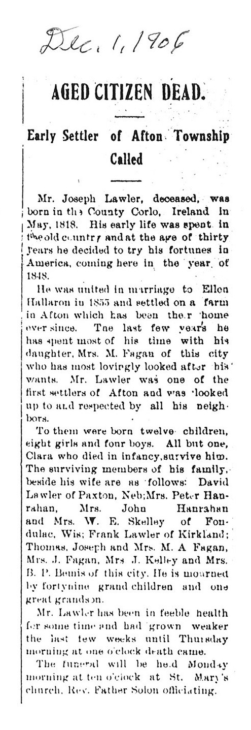 There is a handwritten date above the obituary that says the paper was from 12/01/1906 if this is the correct date of the paper the obit does not give a date of death so seeing he passed away on the Thursday before that would make it 11/29/1906. The obit also only gives the year and month of his birth.