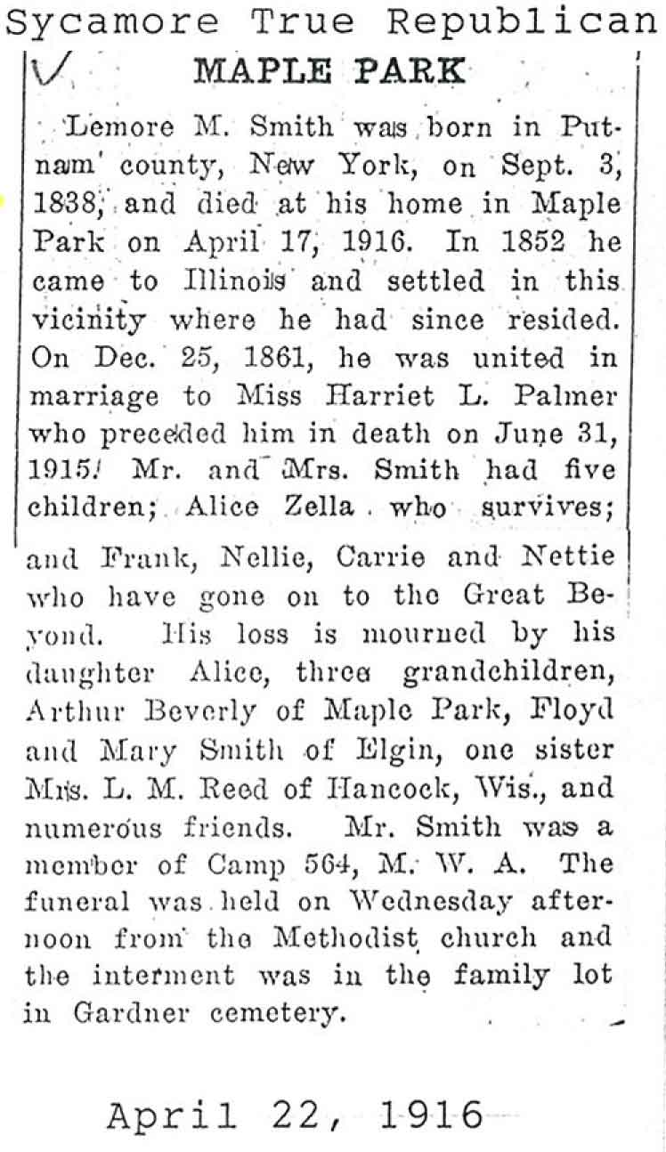 Wife is Elizabeth (Smith) Raymond and she is buried in Mt. Carmel in Sycamore