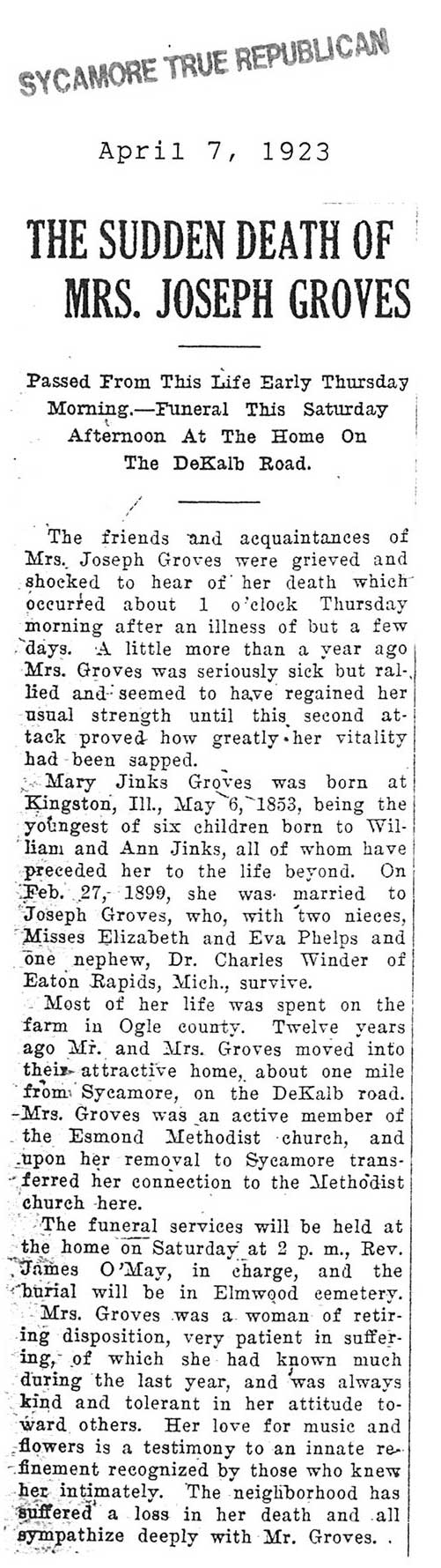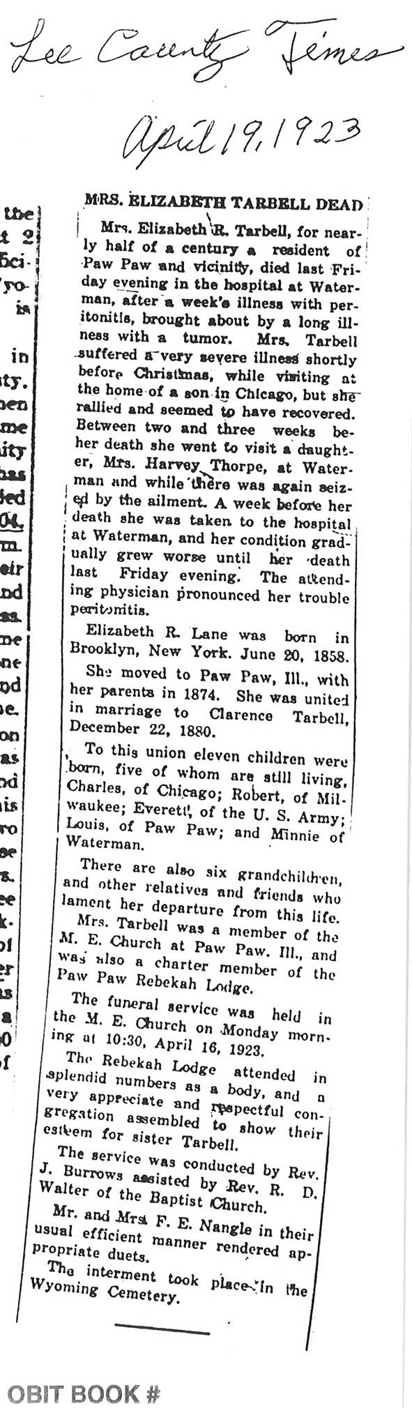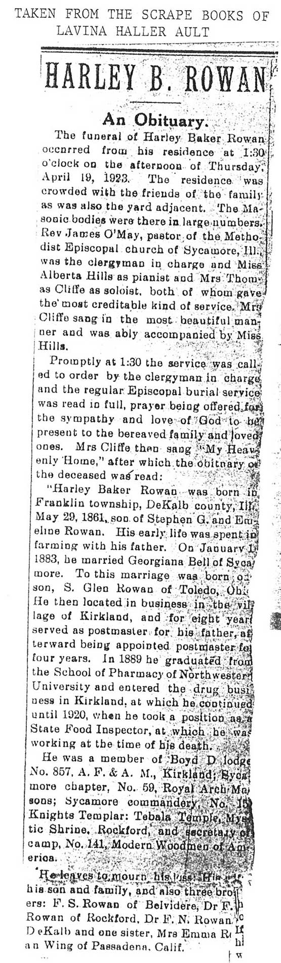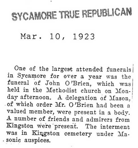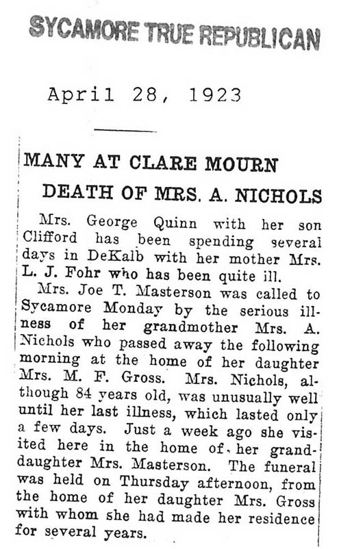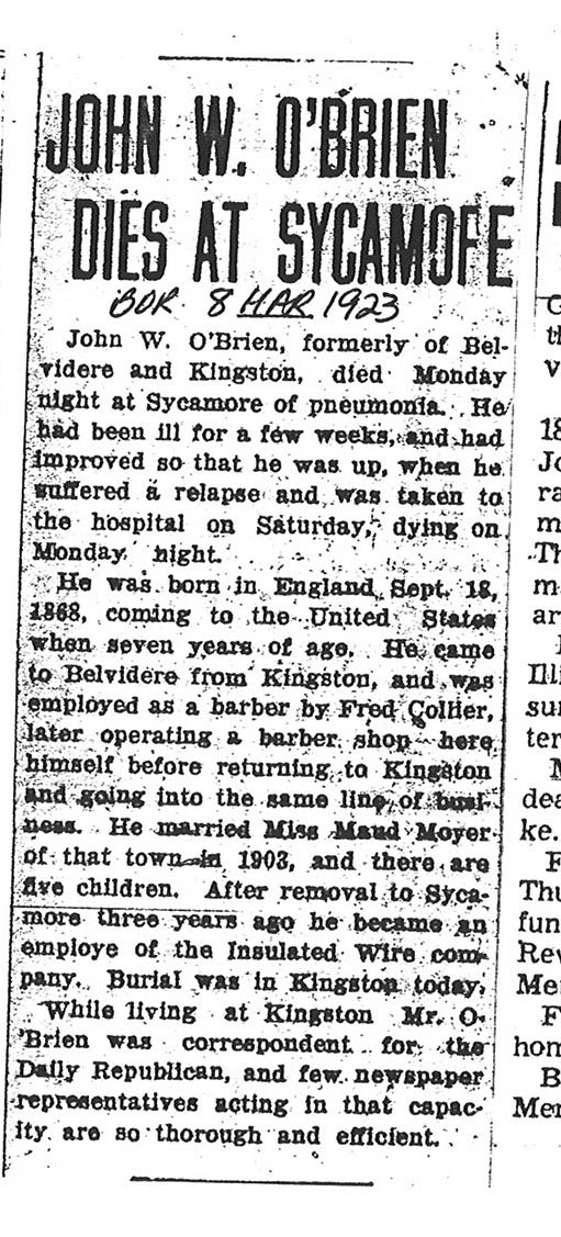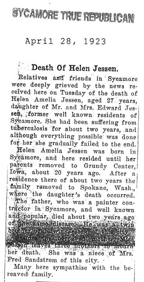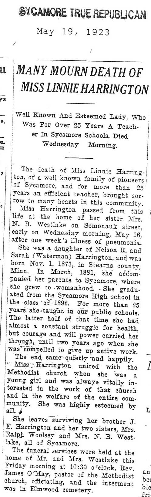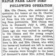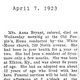 Note: obit has death year as 1923 cemetery listing has year as 1929