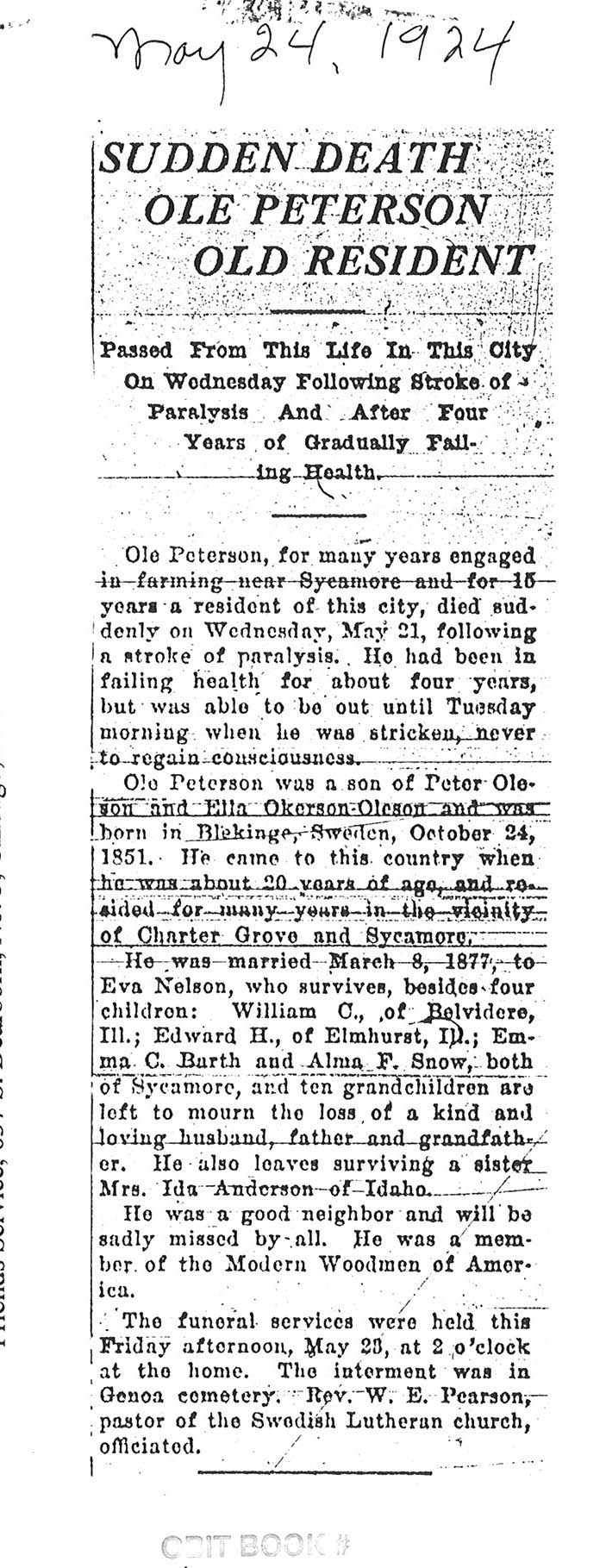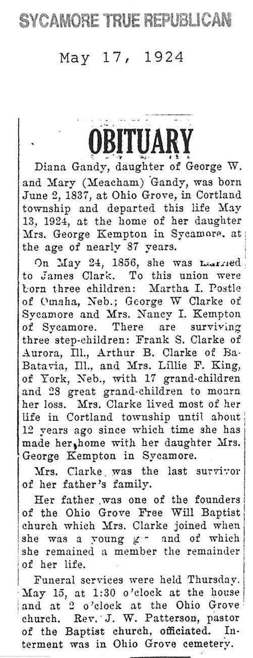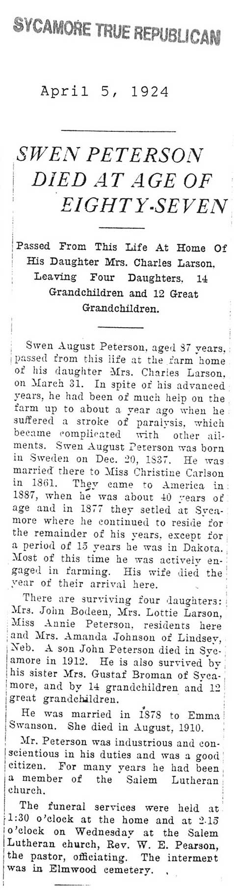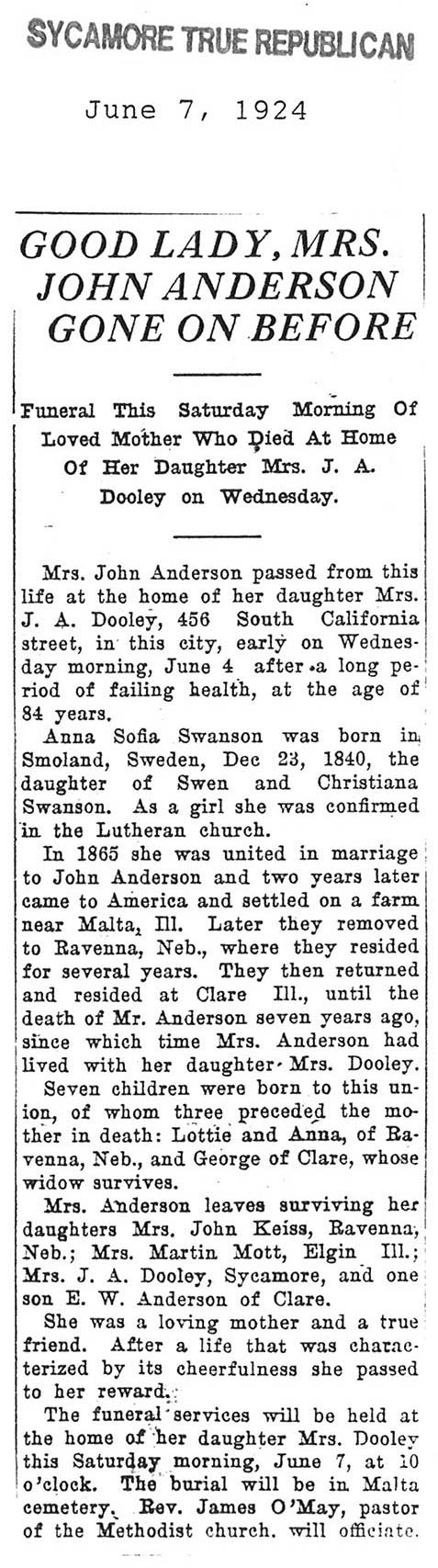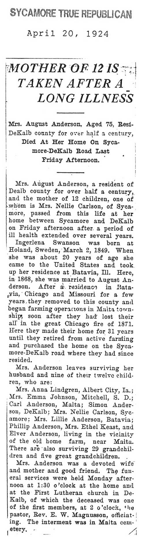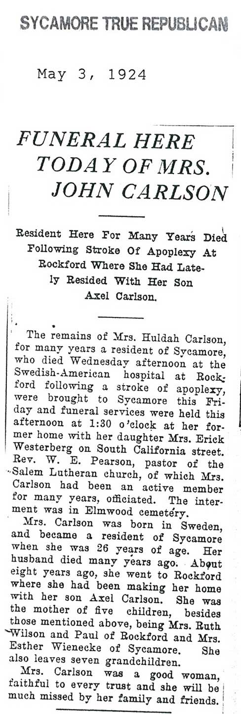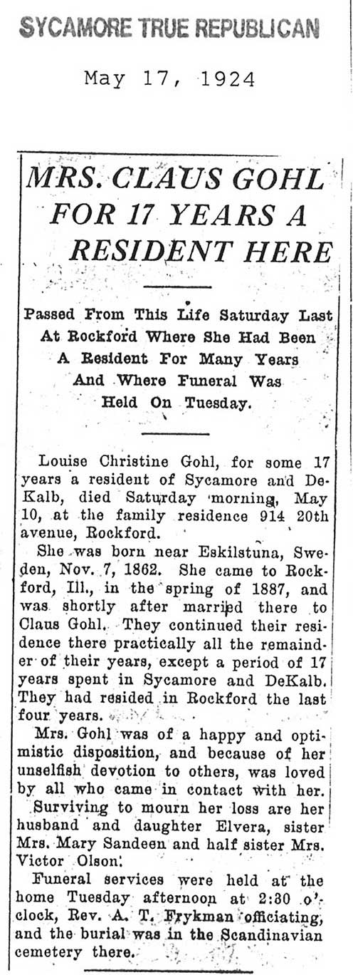 Buried in Southwest Luthern Cemetery - Lee, IL