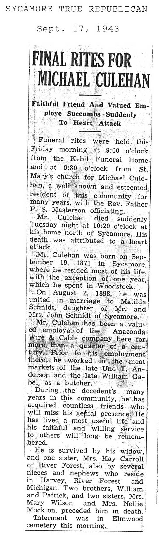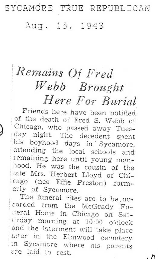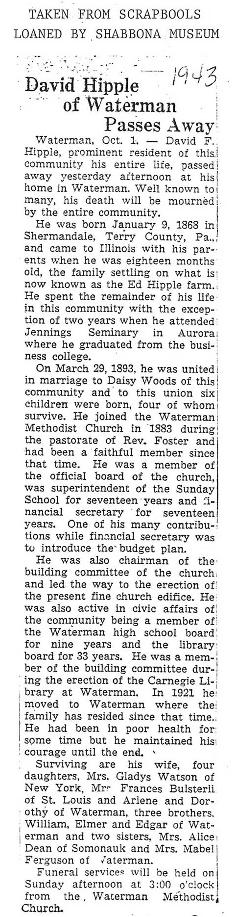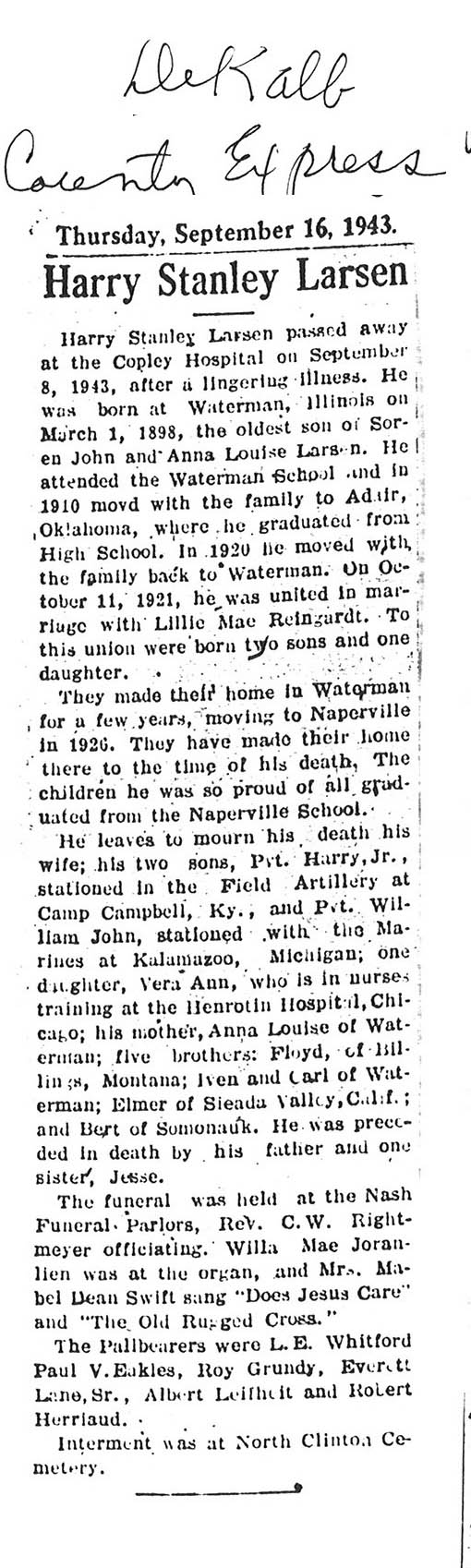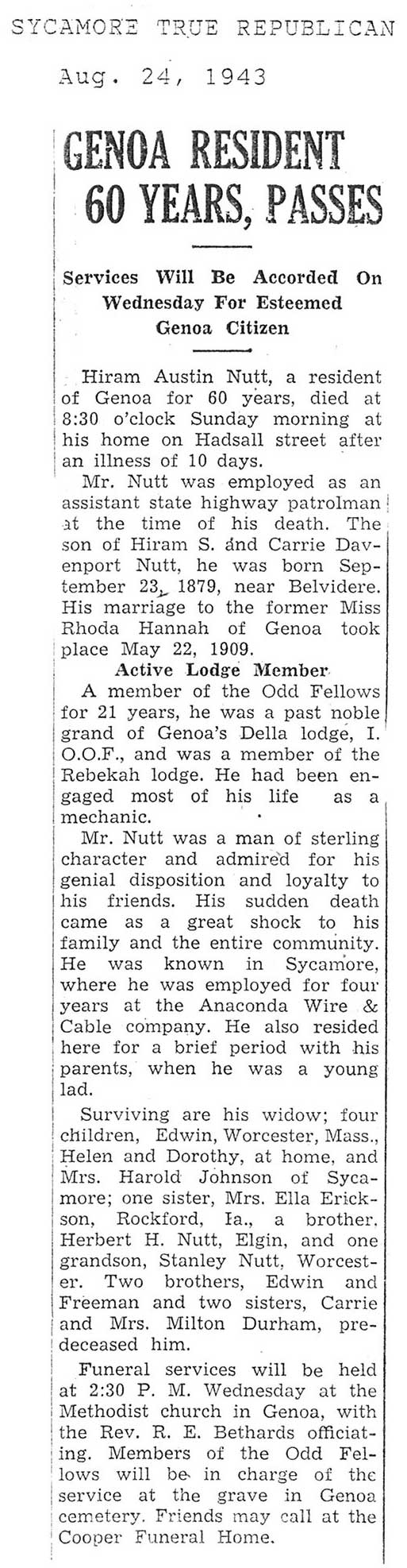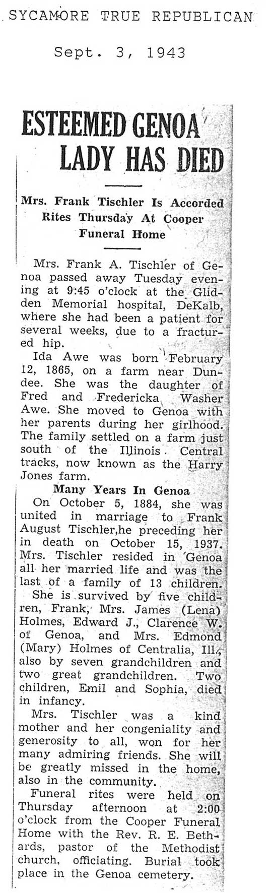 burial was probably in St. Johns cemetery south of Somonauk