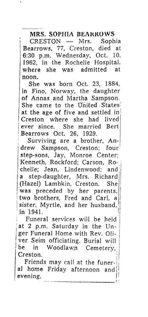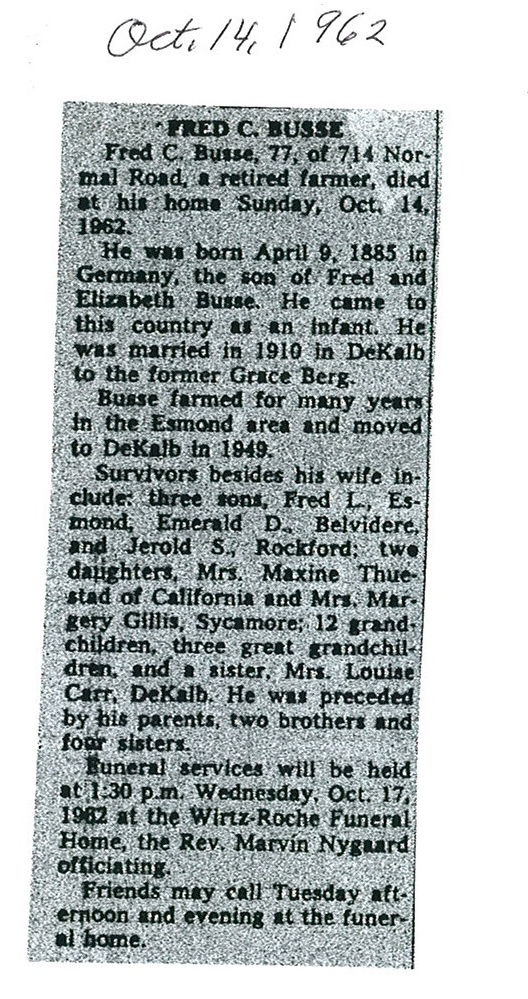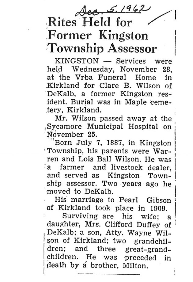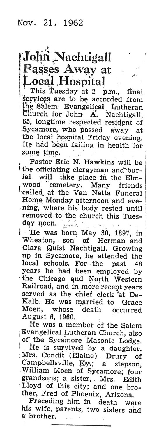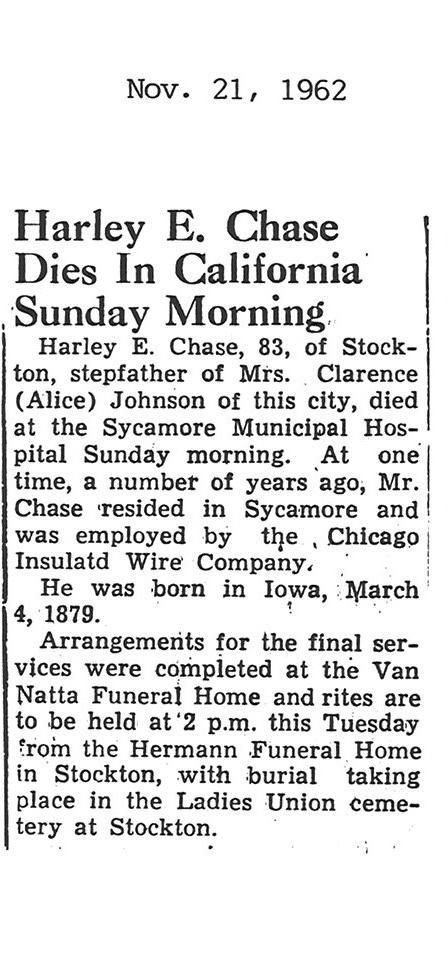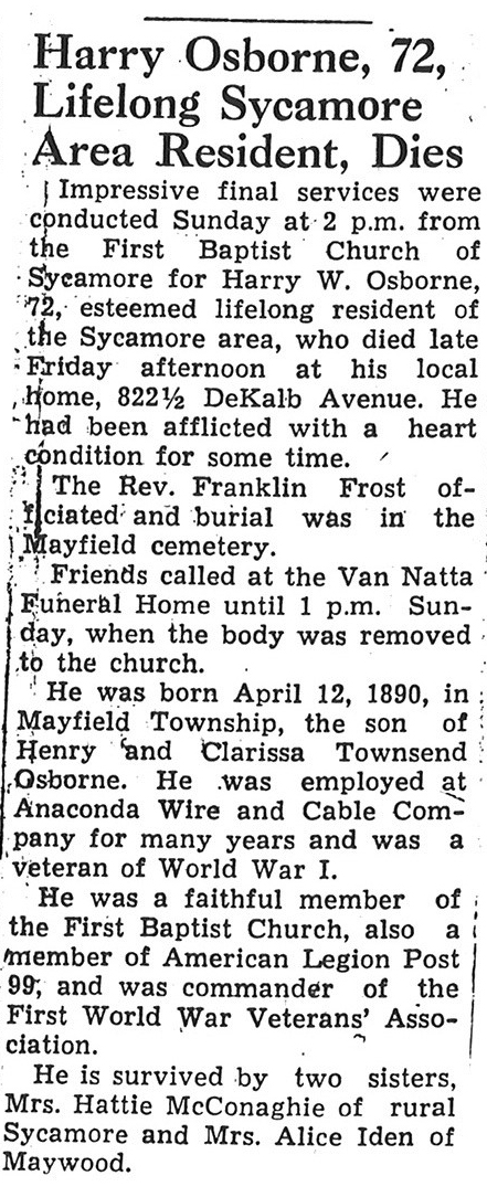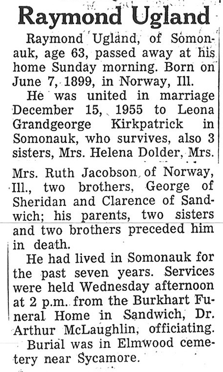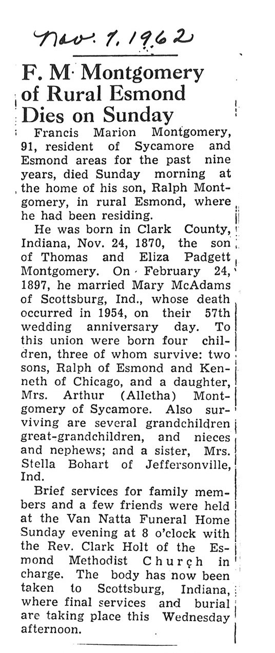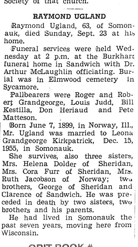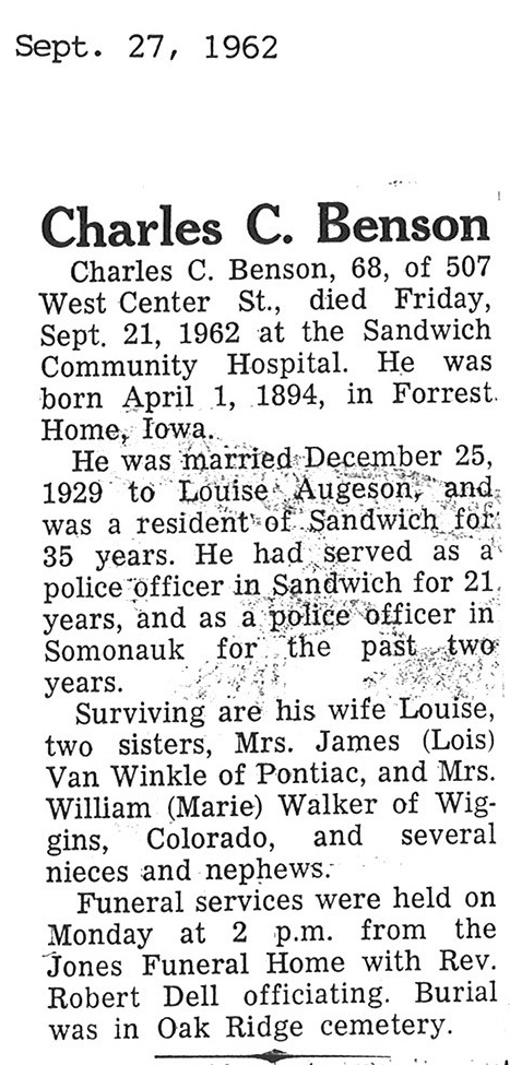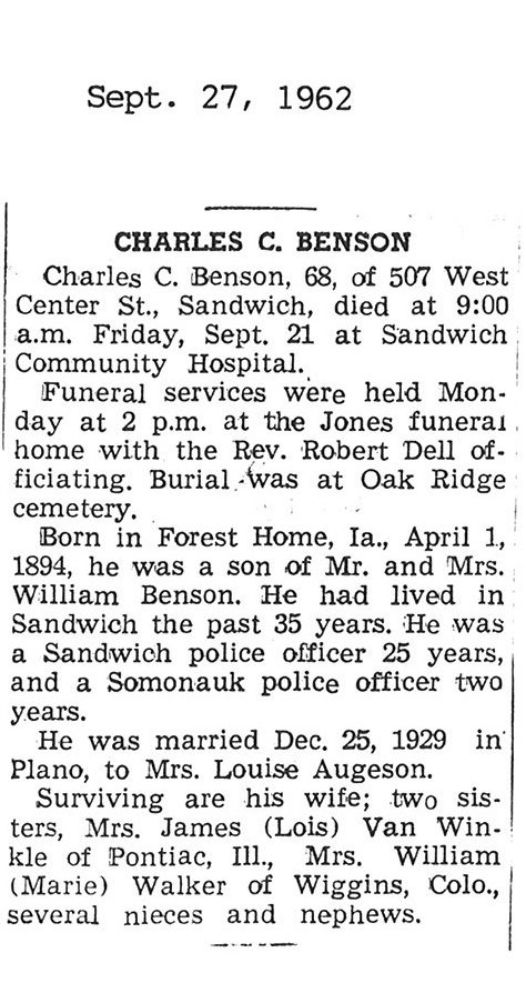 Sept 27, 1962 obit from Sandwich Free press